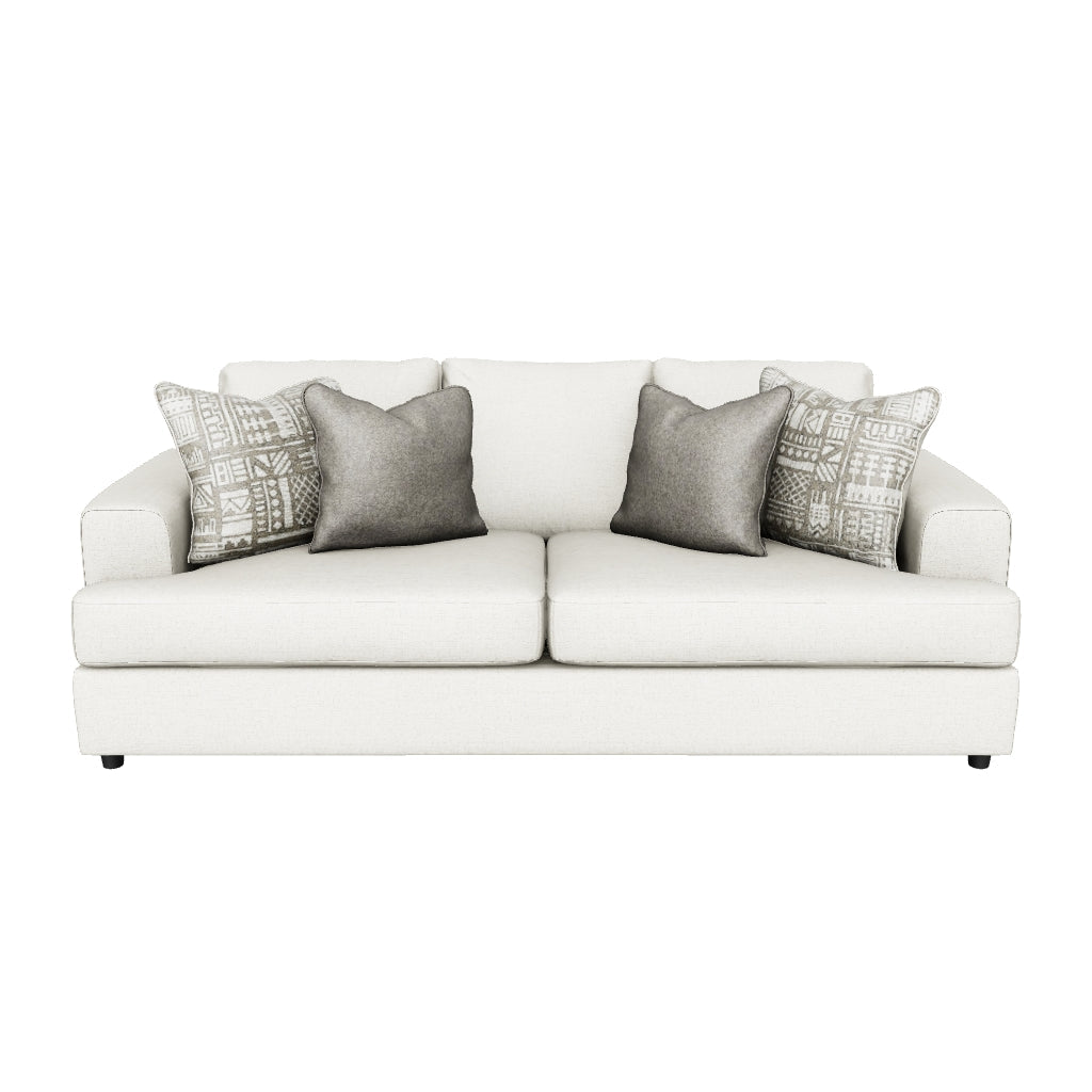 Corner-blocked frame;Attached back and loose seat cushions;High-resiliency foam cushions wrapped in thick poly fiber;Platform foundation system resists sagging 3x better than spring system after 20,000 testing cycles by providing more even support;Smooth platform foundation maintains tight, wrinkle-free look without dips or sags that can occur over time with sinuous spring foundations;4 decorative pillows included;Pillows with soft polyfill;Polyester upholstery and polyester pillows;Exposed feet with faux wood finish