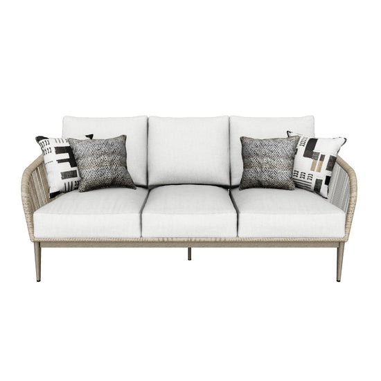 Effortless in its beauty, the Swiss Valley outdoor sofa echoes your easygoing sensibilities. Simply stunning in a brown wood-look finish and paired with handwoven rope on a sturdy aluminum frame, it’s an ideal companion for relaxing poolside or hosting friends alfresco. And with high-performance beige Nuvella+™ fabric, this sofa makes stylish living a breeze.
