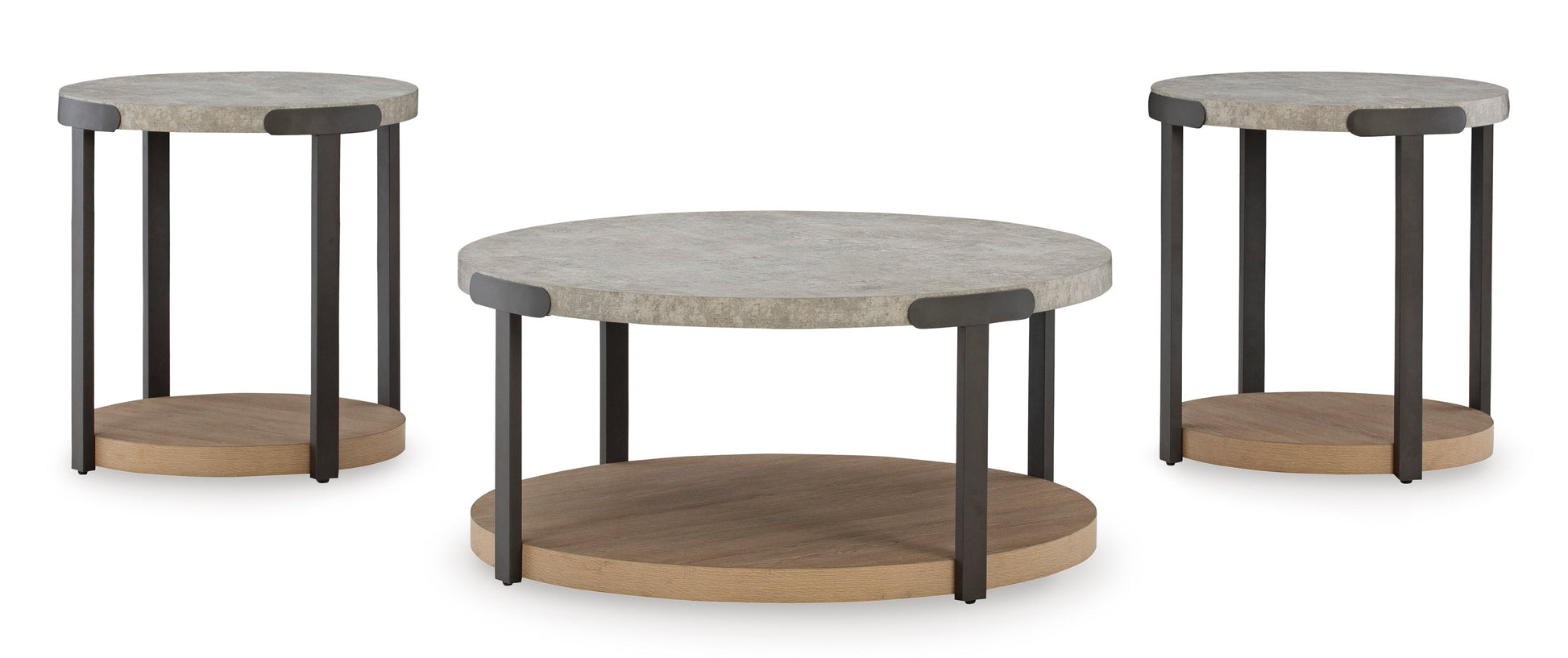 Darthurst TableIncludes coffee table and 2 end tables, Made with decorative laminates, MDF substrate and metal, Tabletop with melamine surface; faux cement pattern and texture, Lower shelf with light natural oak wood grain pattern, Metal frame with dark bronze-tone powdercoat finish, Coffee table includes casters for easy mobility, Assembly required.
