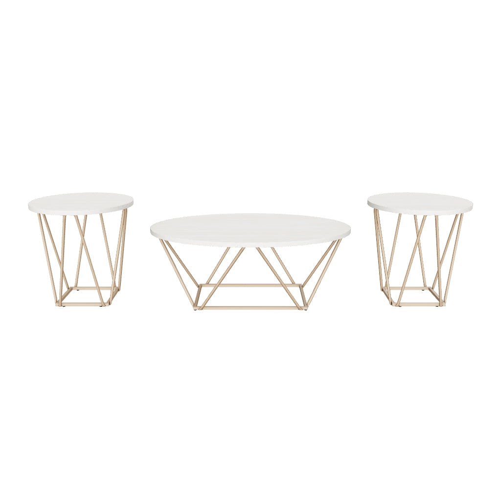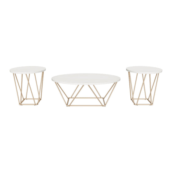Includes coffee table and 2 end tables, Made with decorative laminates, MDF substrate and metal, Tabletop with melamine surface; faux cement pattern and texture, Lower shelf with light natural oak wood grain pattern, Metal frame with dark bronze-tone powdercoat finish, Coffee table includes casters for easy mobility, Assembly required.