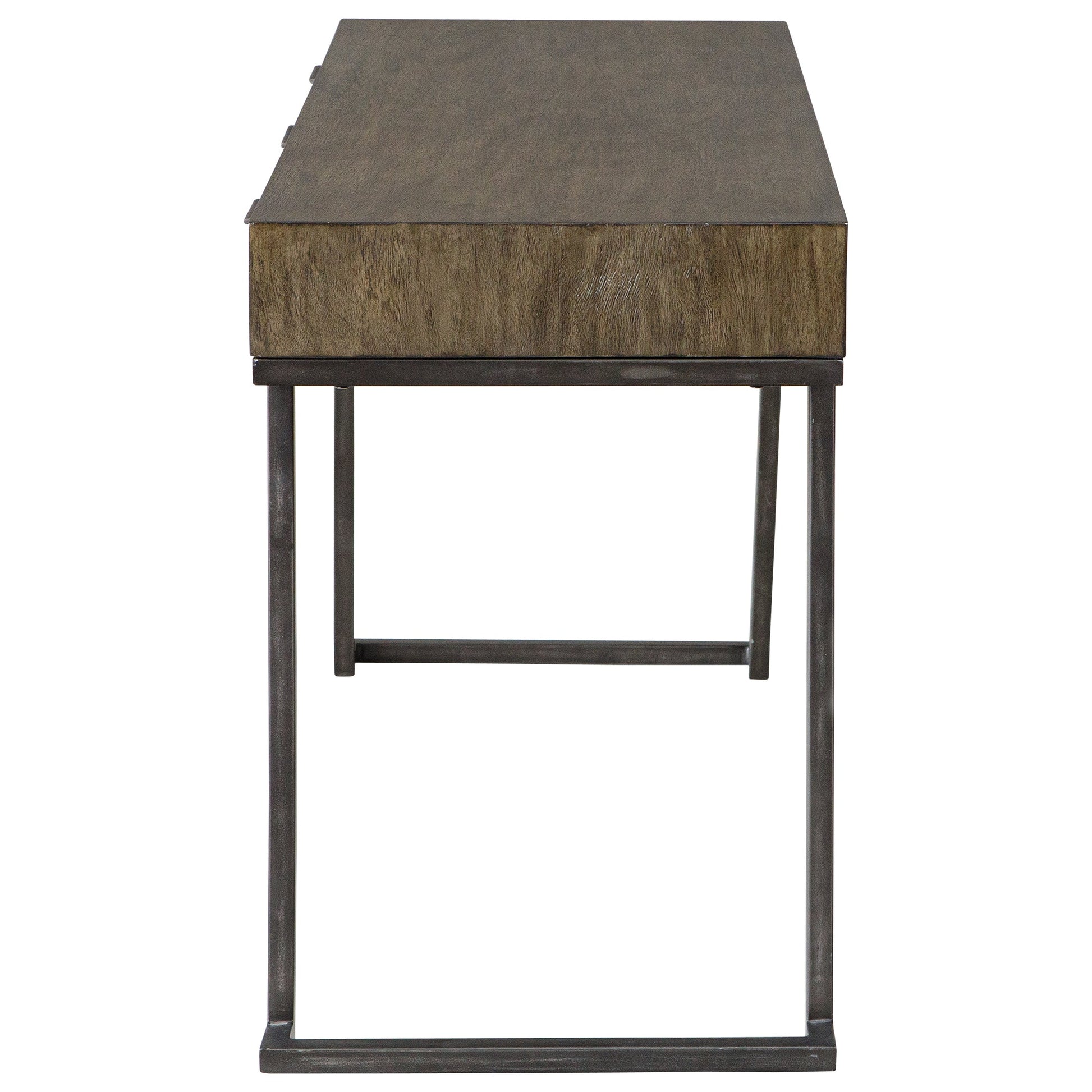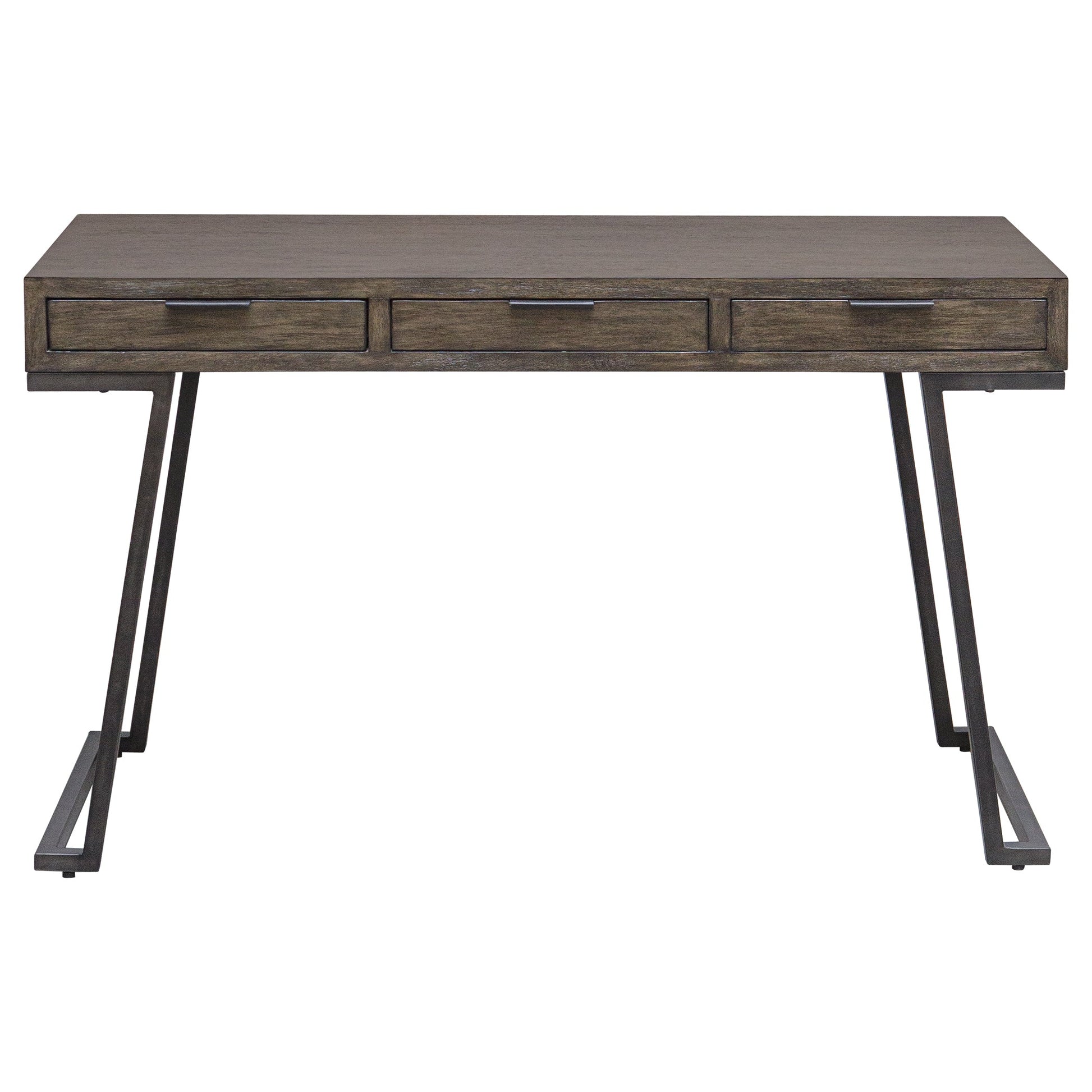 • The Comrade Desk Provides A Perfect Spot For Ample Productivity. The Exterior Is Finished In A Mango Wood Veneer With Light Gray Glazing And Natural Wood Undertones, Supported By A Metal Base In Aged Steel. Features Three Drawers With Coordinating Metal Tab Drawer Pulls.