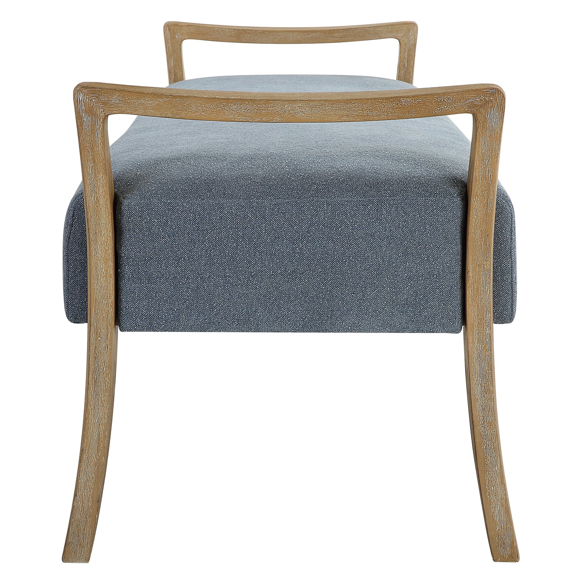إطار خشبي صلب منحني بلطف بلمسة نهائية من خشب البلوط الطبيعي يحيط بالمقعد الواسع المصنوع من البوليستر الأزرق السماوي.