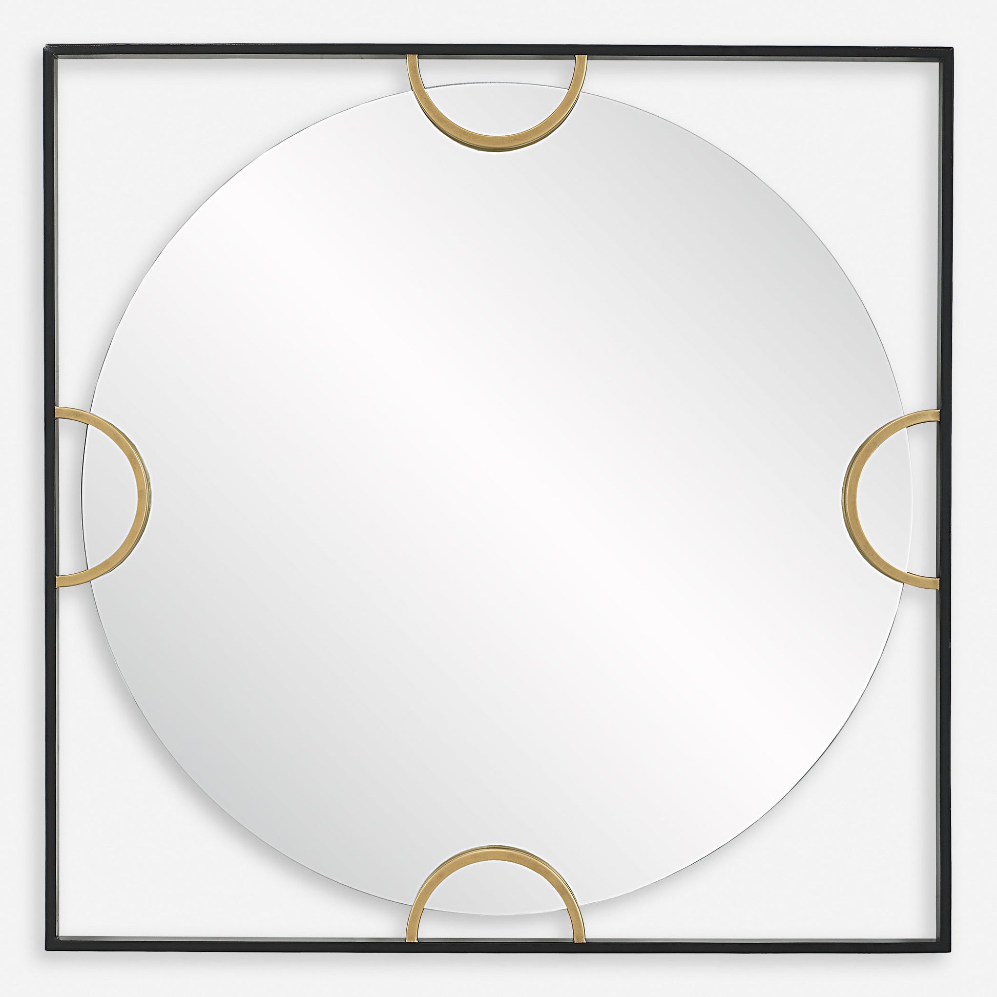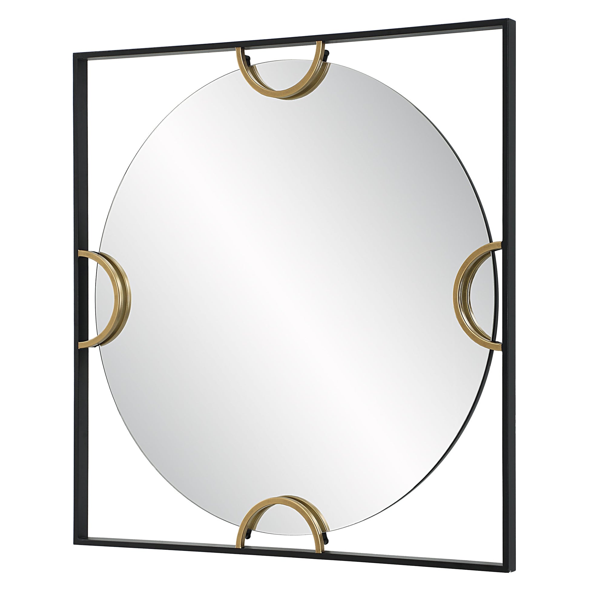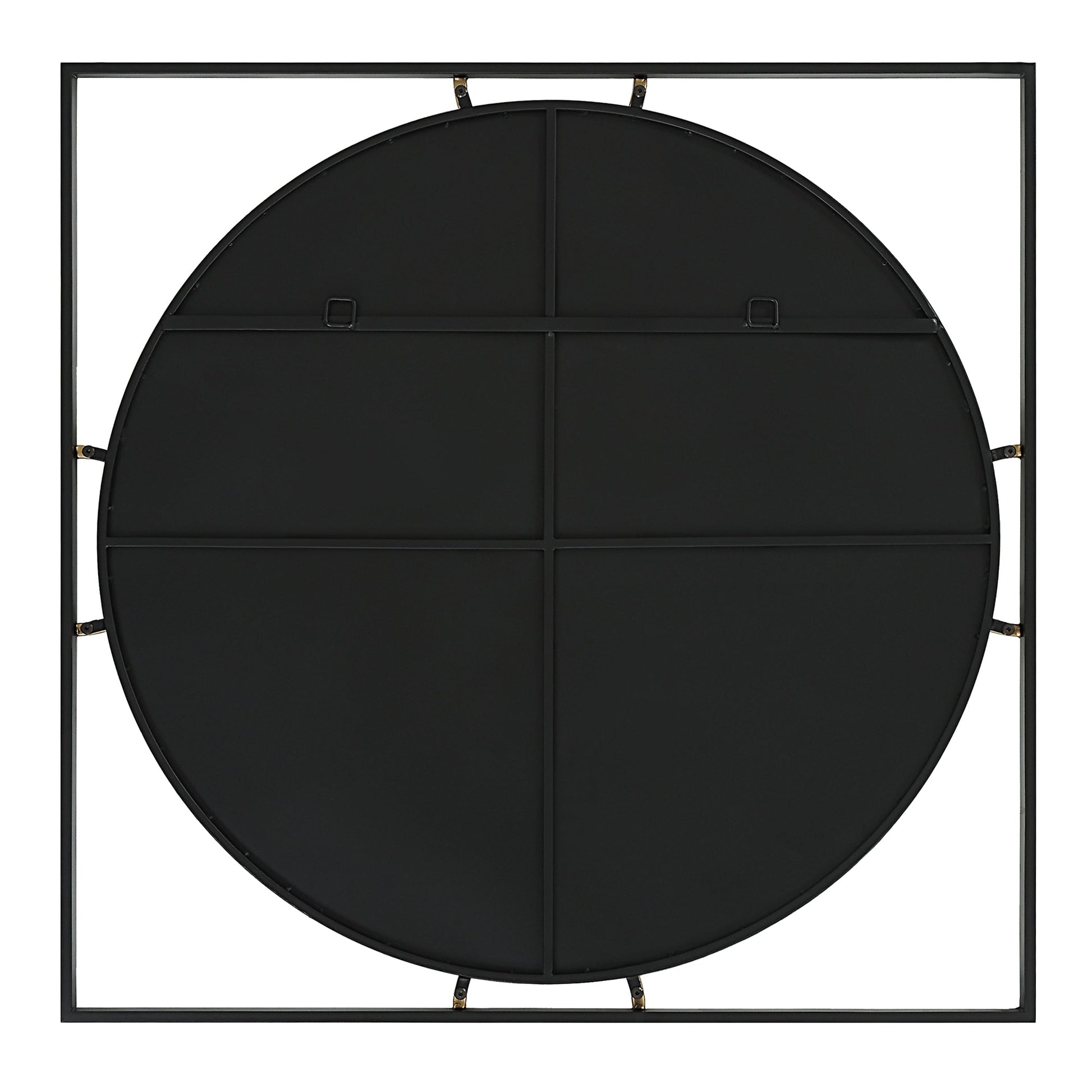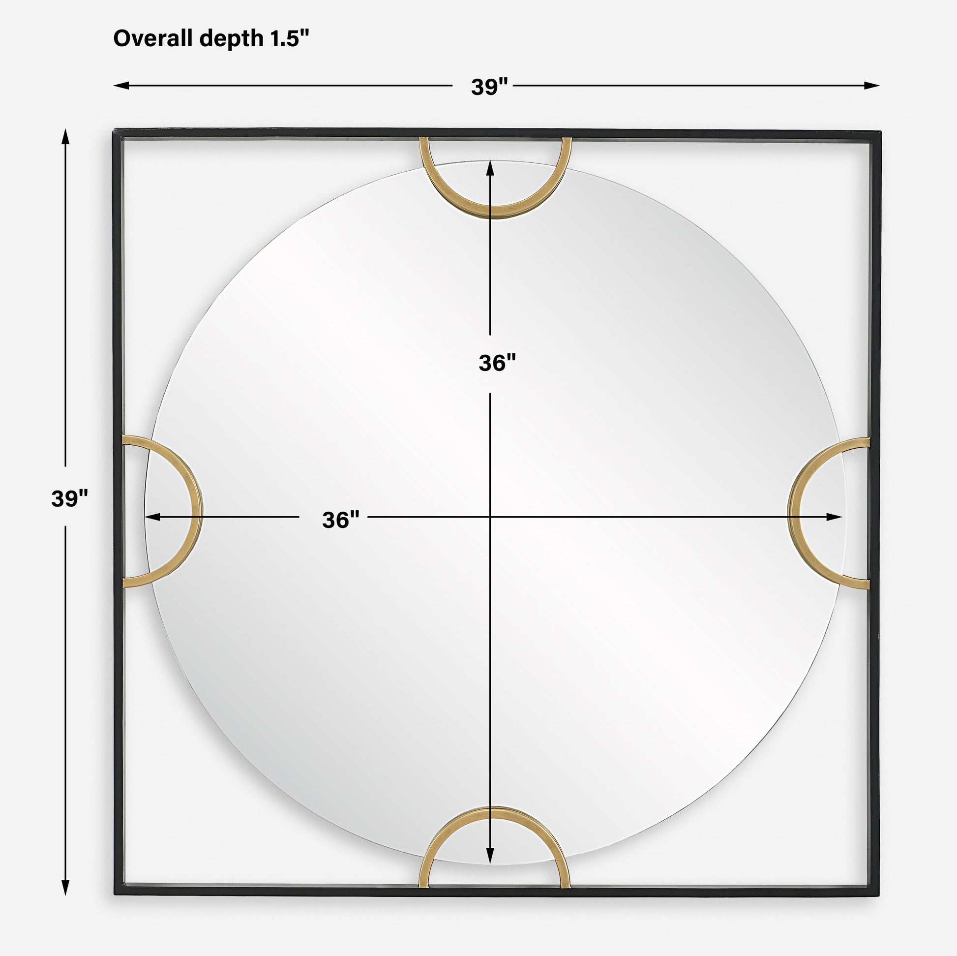 A Square Iron Frame Finished In Satin Black Surrounds A Suspended, Round Polished Edged Mirror, Held With Antique Gold Half Round Iron Bands.