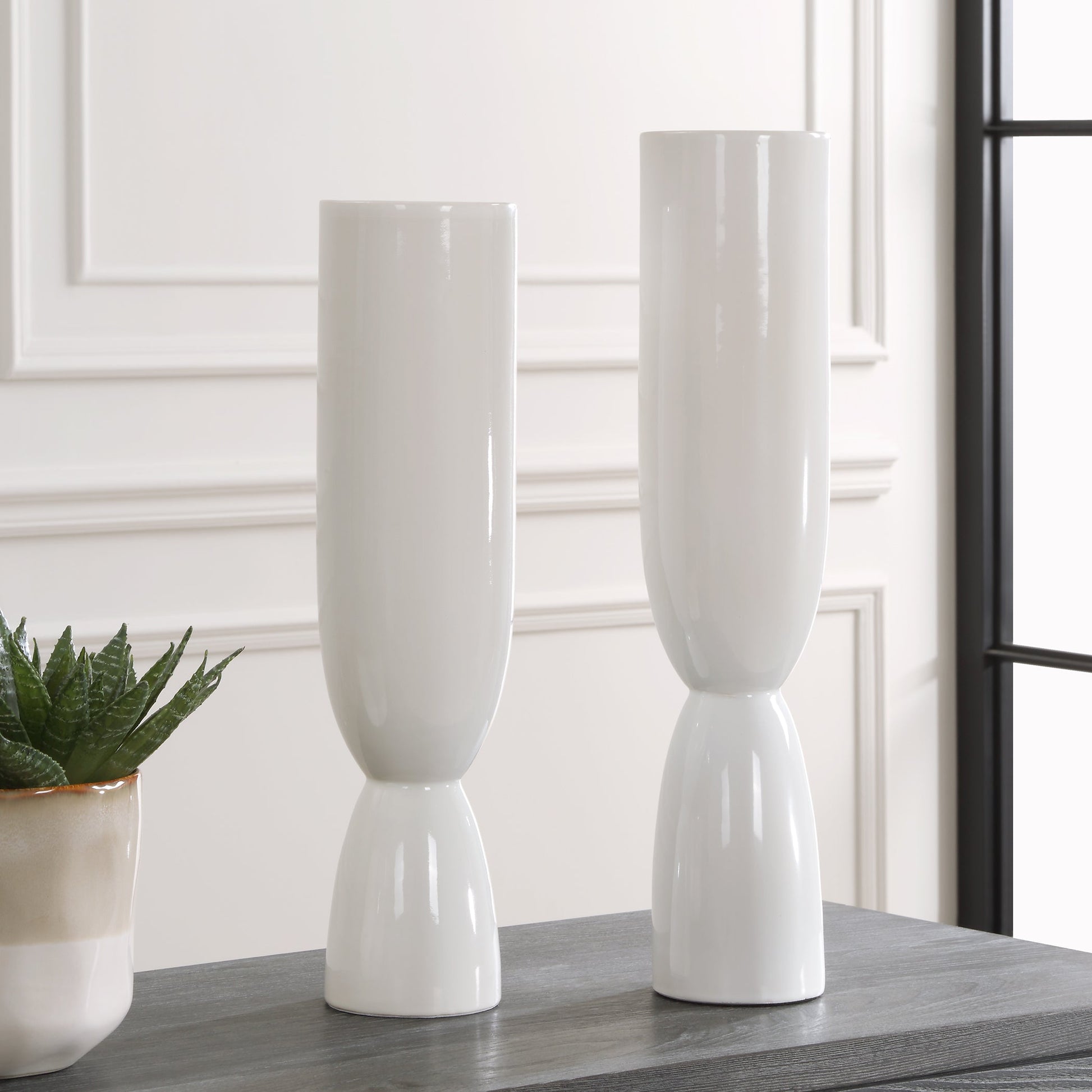 This Set Of Two Ceramic Vases Feature A White Fired Glaze Over Their Unique Shape. Sizes: S-5x18x5, L-5x20x5