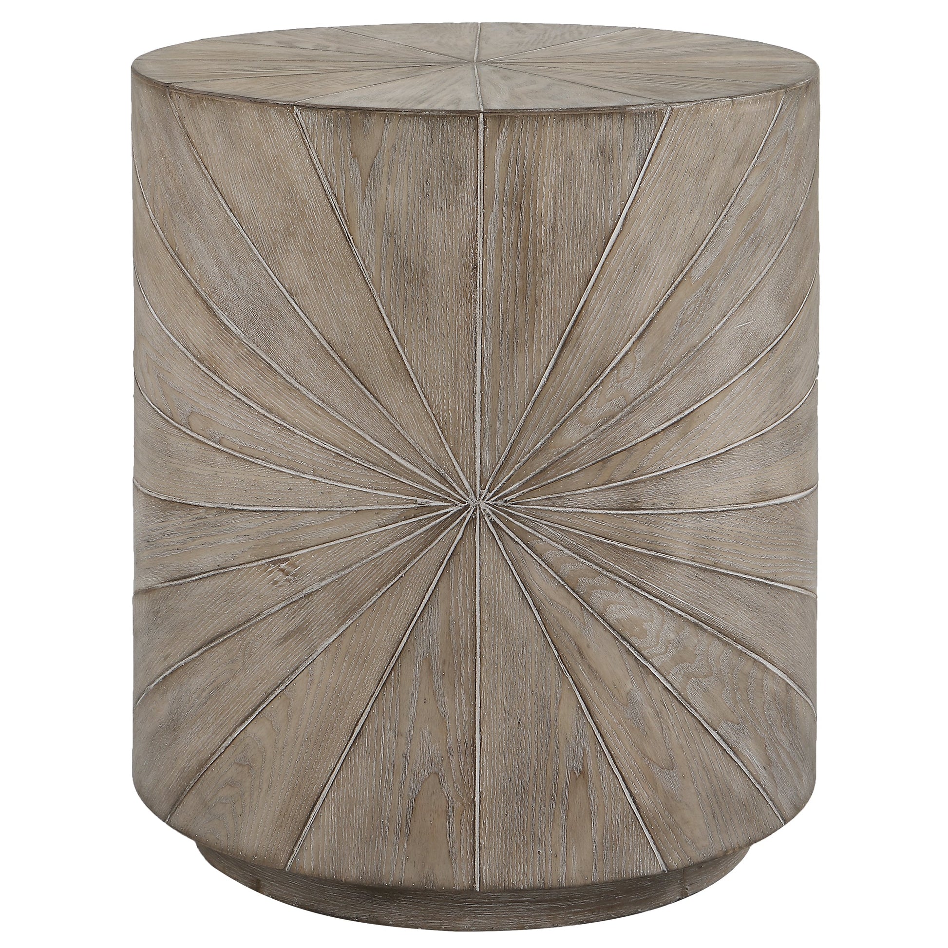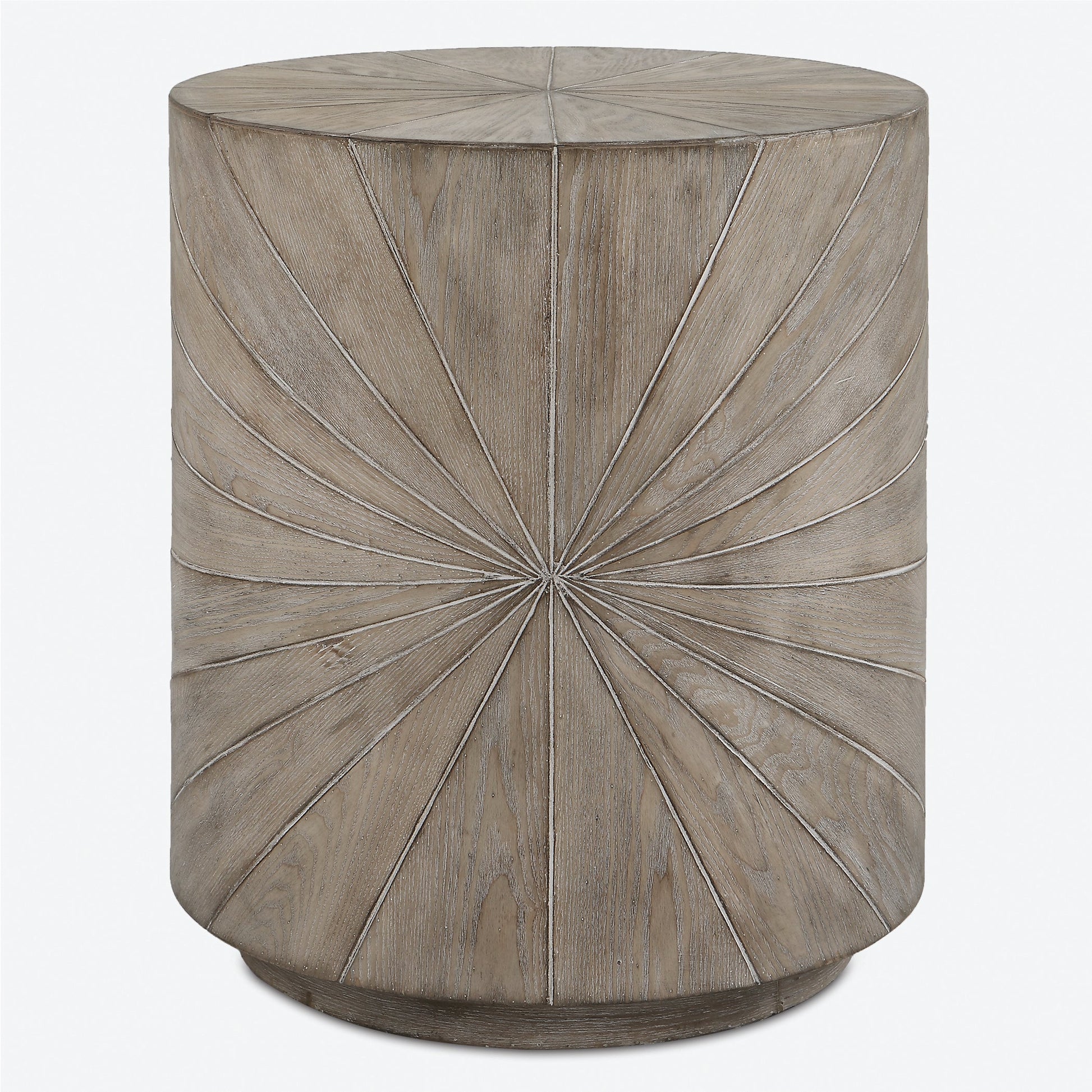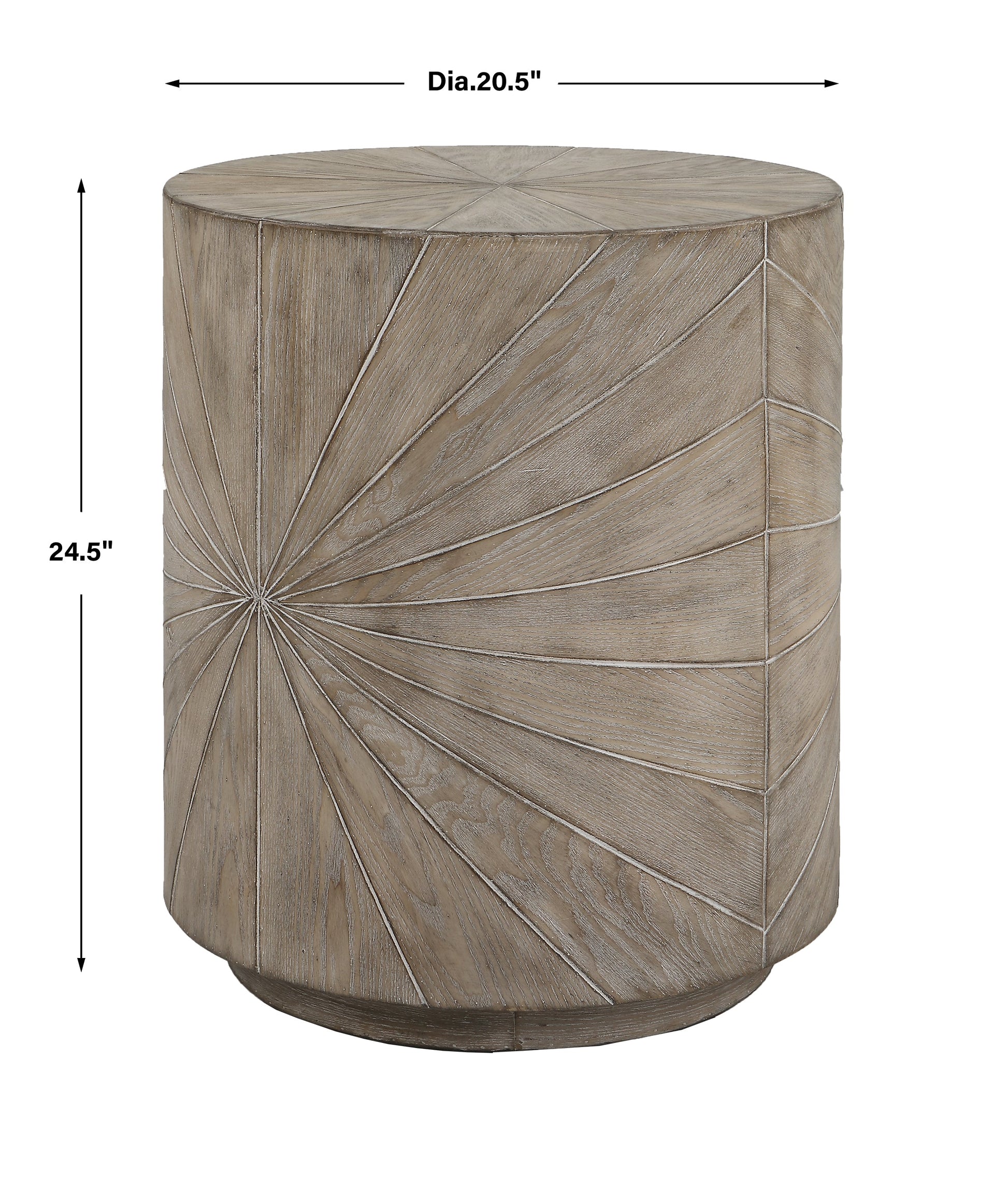 Details & OverviewCrafted From Fir Wood Veneer, The Starshine Side Table Features A Starburst Motif Surround Finished In Warm Gray Stain With Light Cerusing That Accentuates The Natural Wood Grain.