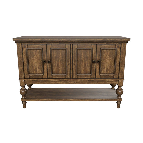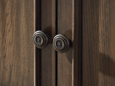 منتجات خشبية وغيرها، خزانة طعام، مصنوعة من خشب صلب، وقشرة بلوط، وقاعدة من خشب ليفي متوسط الكثافة (MDF)؛ لون بني جوزي غني مع ملمس حبيبات الخشب؛ مقابض معدنية دائرية بلمسة نهائية برونزية عتيقة؛ خزانتان ببابين مزدوجين، كل منهما مزودة برف قابل للتعديل؛ رف سفلي؛ يتطلب التجميع