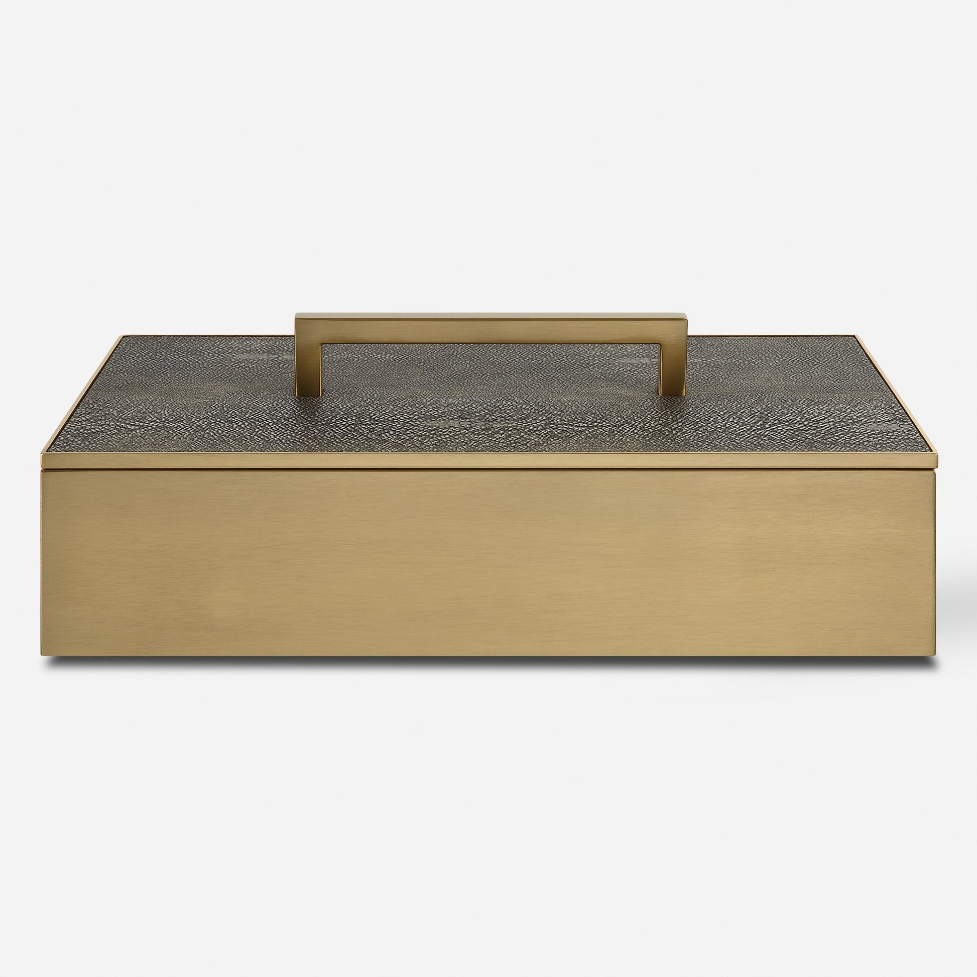 A classic silhouette with modern touches, this metal box is finished in a classic brass and covered with a lift-off lid finished in an elegant gray faux shagreen with brass handle.Item Dimension (cm ) :