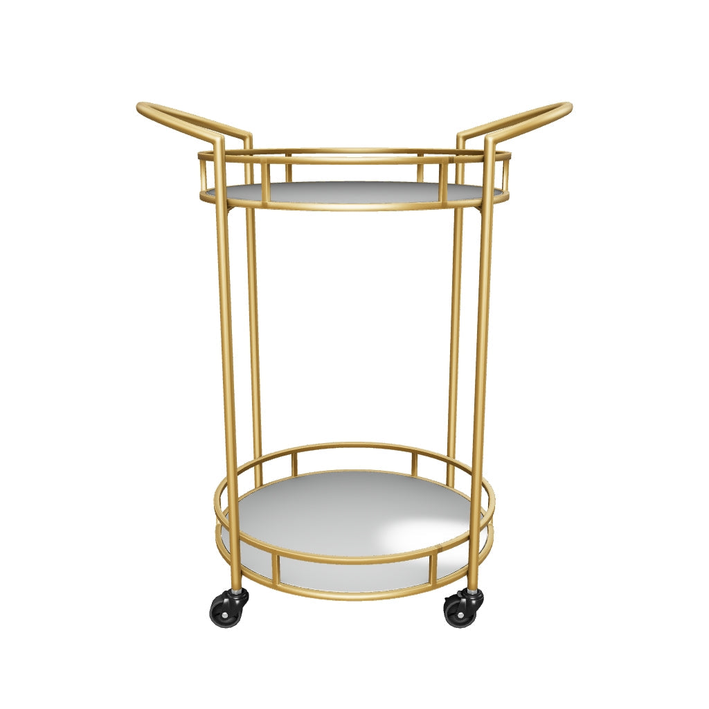 Add a bright spot to your contemporary space with the Wynora bar cart. Its beautifully bold blend of goldtone metal and mirrored glass heightens your home's modern aesthetic. It’s a striking choice for your kitchen or entryway, with locking casters allowing you to serve in style whenever and wherever it's needed.