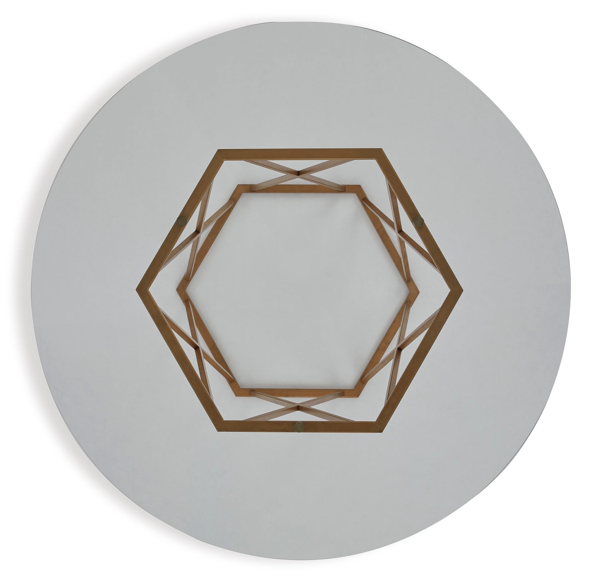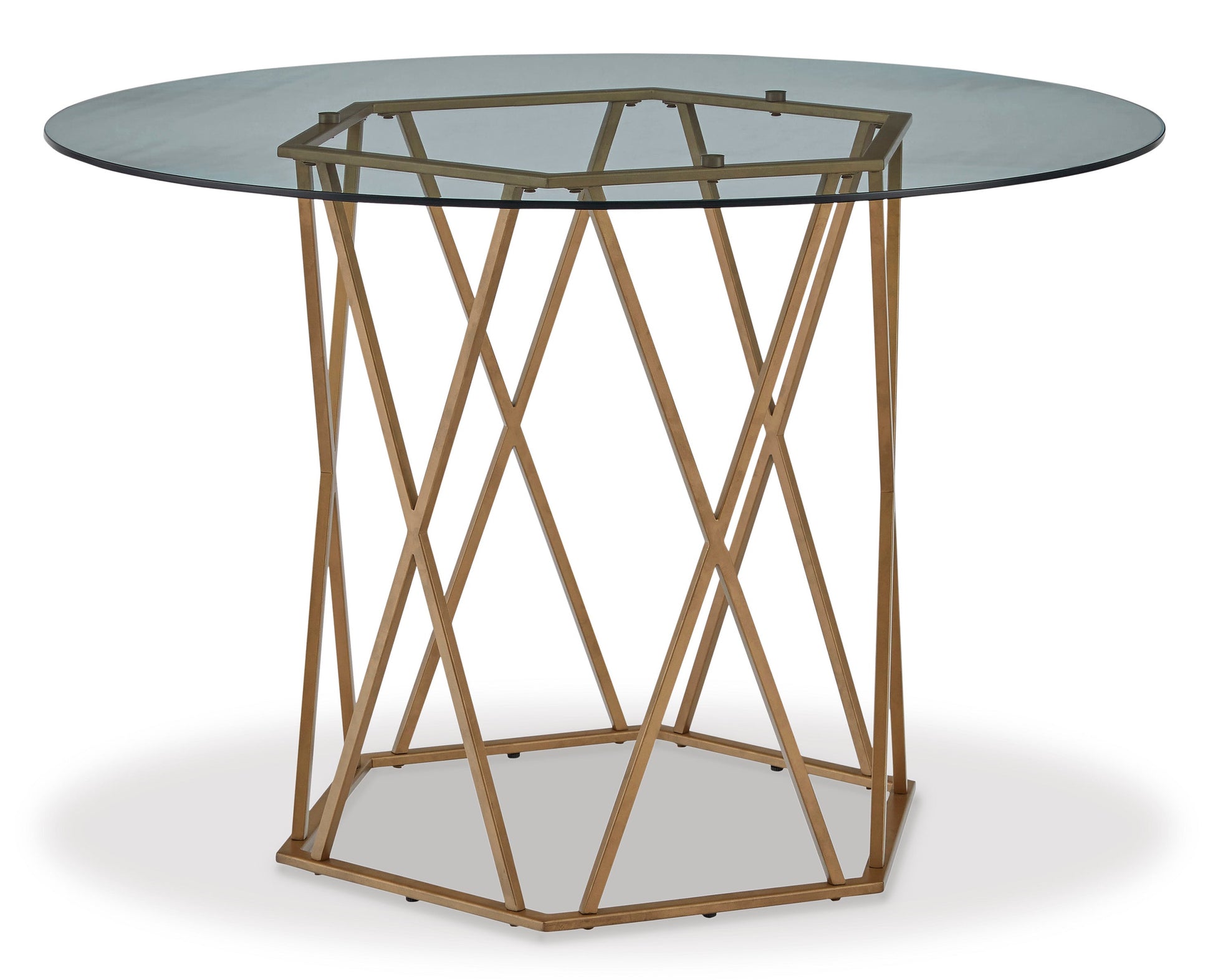 Wynora Dining Table: This bold round dining table pairs modern contemporary design with inviting style. Its distinctive hexagonal X-base with a gleaming goldtone finish creates a striking look that's fresh and forward-thinking.