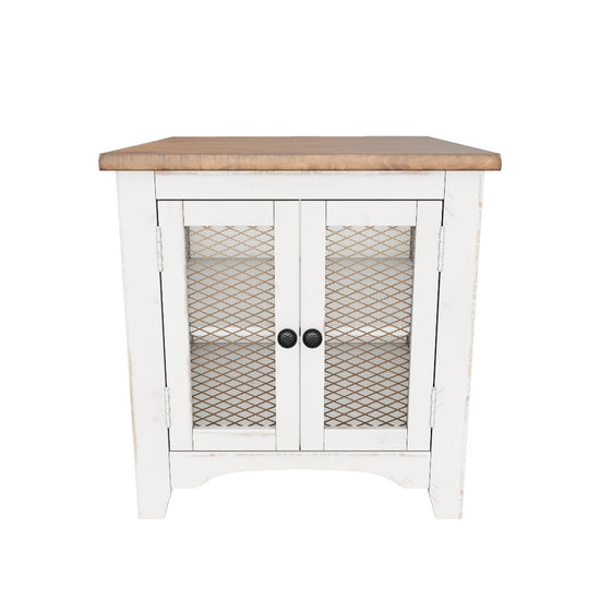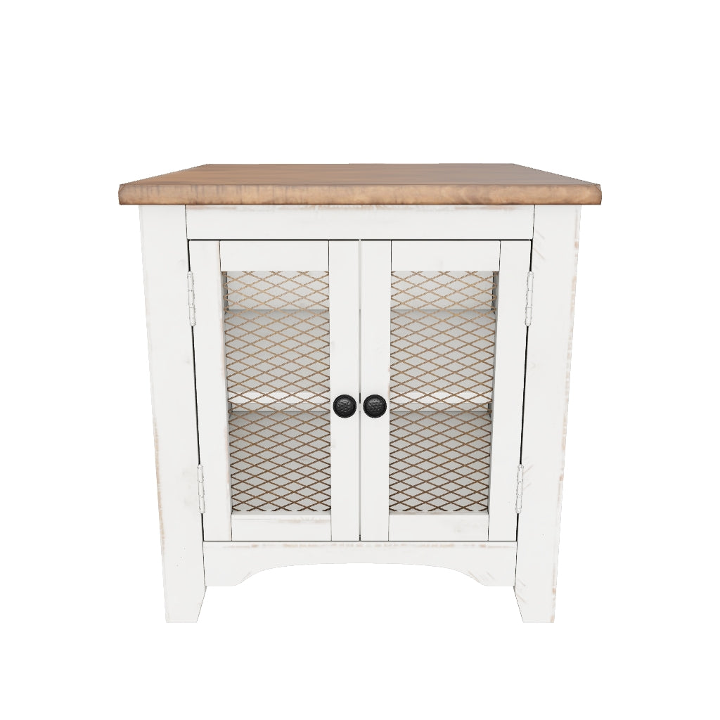 Details & OverviewThe Wystfield rectangular end table is expertly crafted with a distressed vintage white finish and contrasting natural pine tabletop. This table combines a look you'll love with the storage you need. A single cabinet hides easy-access storage perfect for magazines, books and more, while the open shelf in the middle provides more storage to keep smaller items close at hand. In addition, the AC power supply with two USB charging ports keeps all of your electronics running smoothly. This attractive end table blends rustic and natural style while lending a unique feel to your home.
