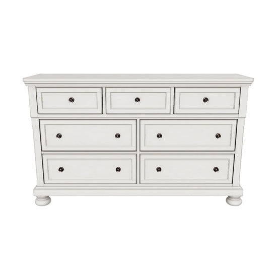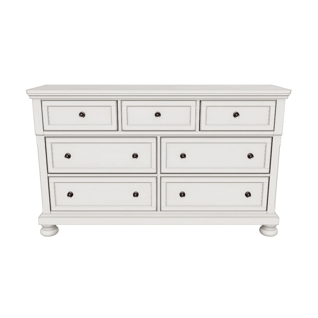 Elegant, timeless furnishings take your bedroom to the next level. Nothing does that better than the Robbinsdale dresser. The antiqued white finish with a wonderful grain texture radiates sophistication, while the dark bronze-tone hardware adds an ornate touch. A hidden pull-out tray behind the top middle drawer puts your small valuables out of sight. Felt-finished top drawers round out the piece for the ultimate tasteful bedroom.