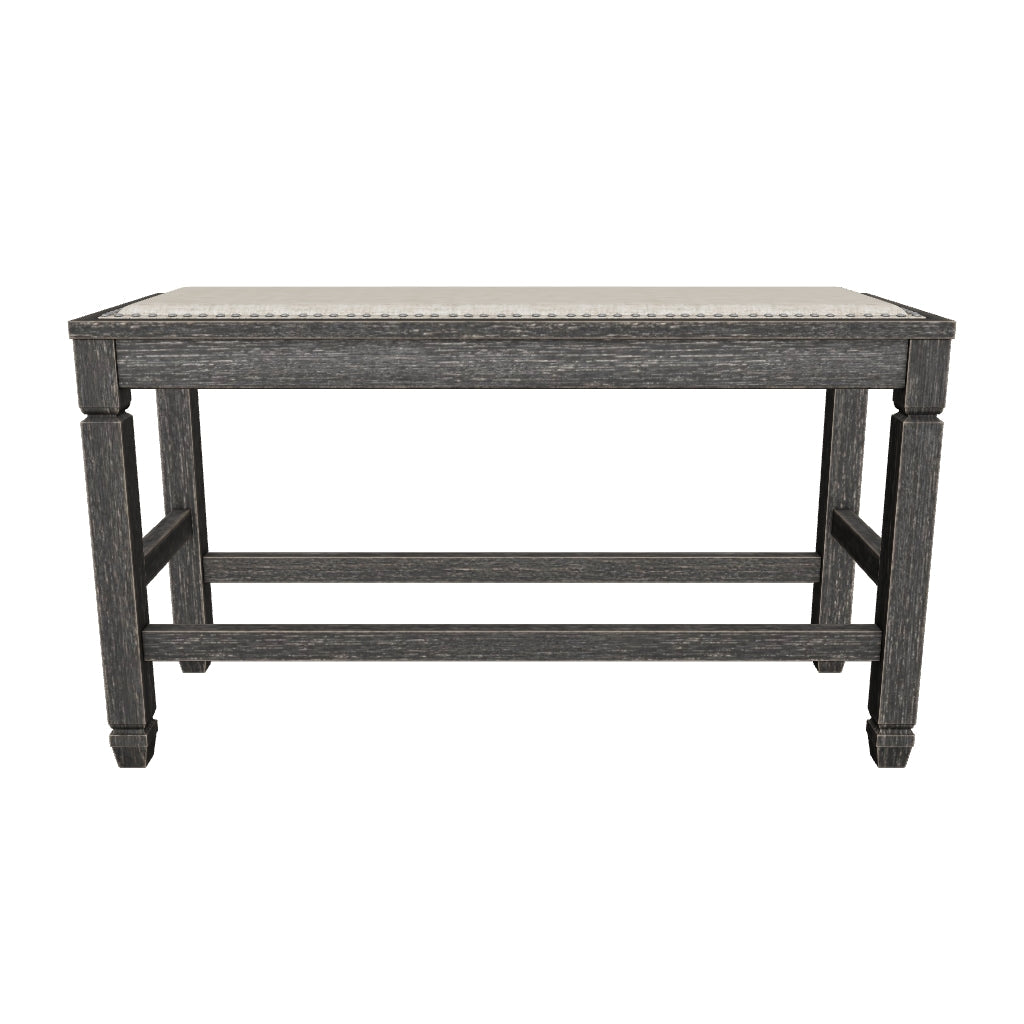 Invite your family into the heart of your home with the Tyler Creek upholstered dining room bench. Tapered legs are a sturdy foundation, while the counter-height design raises the bar on fine dining. Textured black finish and heavy woven neutral upholstery accented with silvertone nailhead trim is trend-right urban farmhouse style without all the fuss.