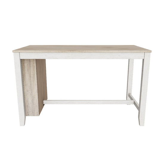 The Skempton counter height table with storage invites you to raise the bar on small space living. An inspired choice for coastal chic or modern farmhouse settings, this clean-lined, simply striking table doubles the charm with a brown tone top with plank effect, paired with a grayish white base with rub through effect for timeworn appeal. Built-in 8-bottle wine rack and pair of open shelves make the most of every inch of space.