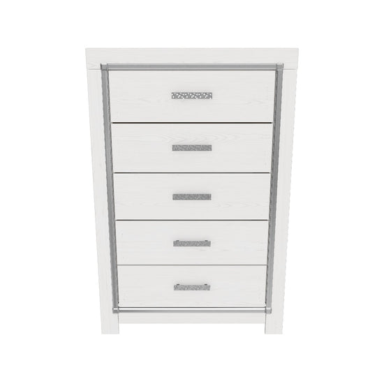 The epitome of fashion-forward design, the Altyra chest of drawers is a beautiful blend of style and luxury. Shiny chrome-tone accents, a pearlized finish and mosiac pulls bring a glam touch to the richly rustic appearance. Five smooth-gliding drawers provide plenty of storage space for your wardrobe needs.