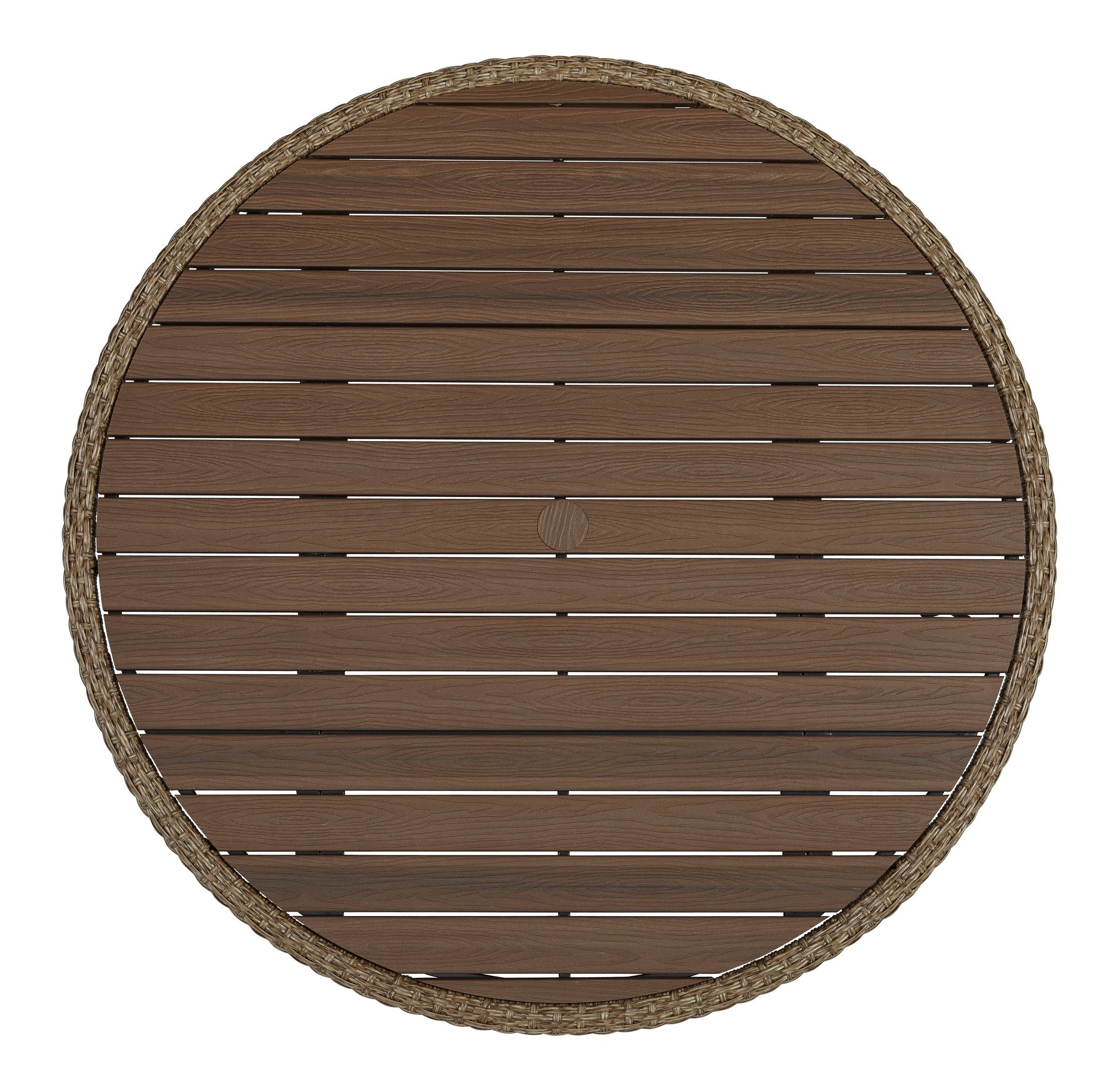 Resin wood look tabletop;Powder coated steel frame;Stainless steel hardware;Umbrella hole (umbrella not included);Designed to withstand the harsh elements of the outdoors;Assembly required