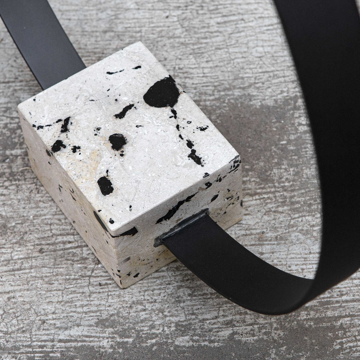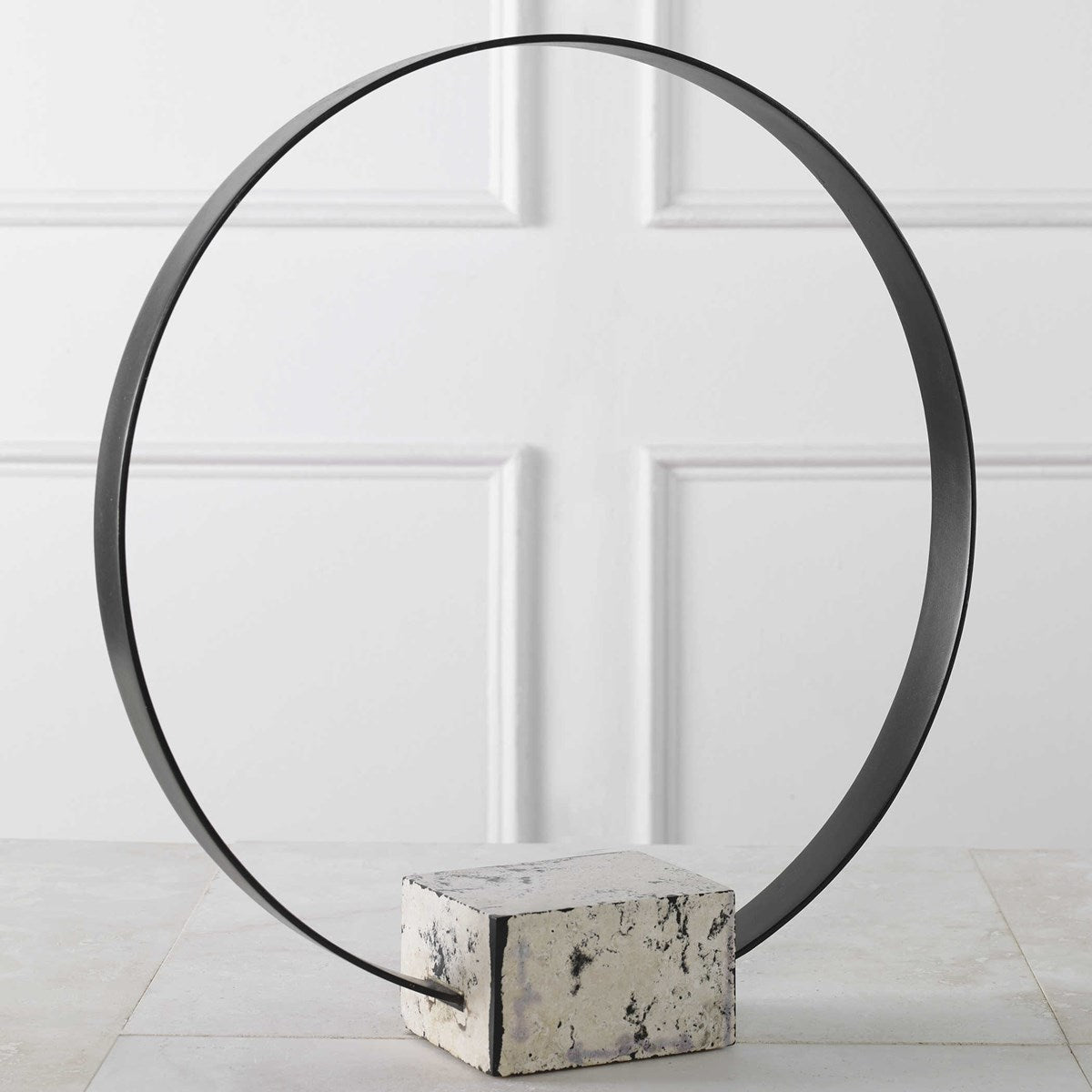 Details & OverviewThis Circular Metal Sculpture Is Finished In A Brushed Satin Black Anchored By A Natural White Coral Stone Base With Black Accents.
