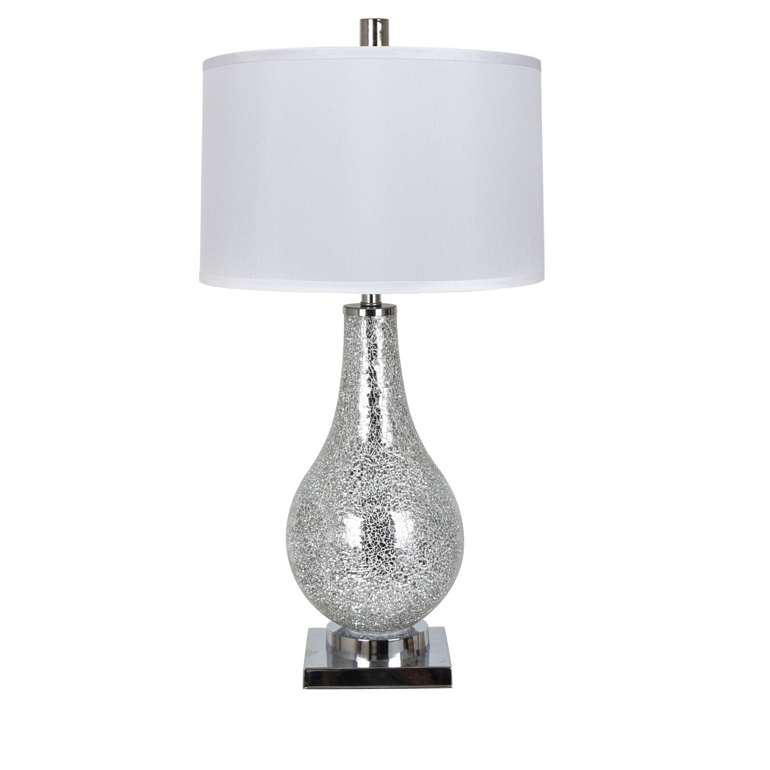 This table lamp features a gleaming mosaic base made of silver-colored resin and metal. The mosaic pieces are arranged in a swirling pattern, catching the light and creating a visually interesting texture. The base tapers gently from its widest point at the bottom to a narrower section at the top. Sitting atop the base is a square white silk shade that diffuses the light and adds a touch of softness to the lamp's overall look.