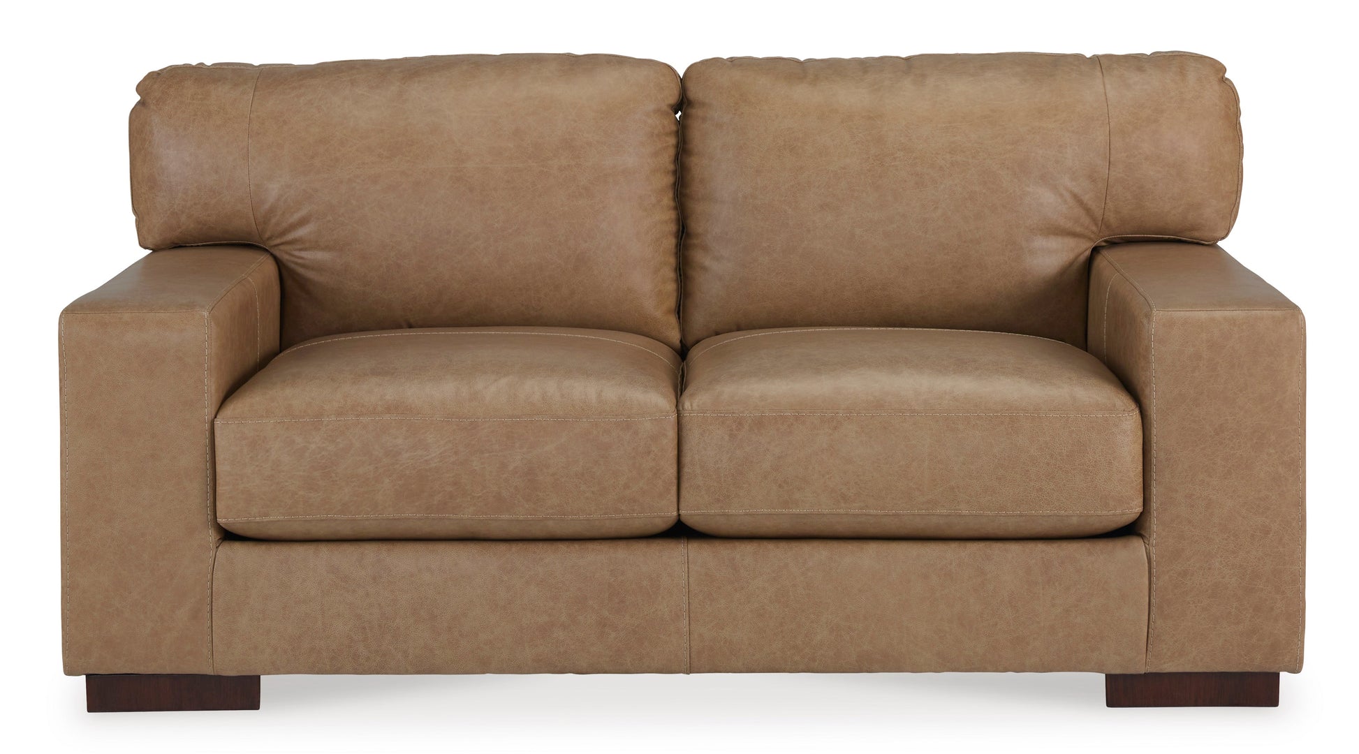 Corner-blocked frame;Attached back and loose seat cushions;High-resiliency foam cushions wrapped in thick poly fiber;Genuine leather typically covers inside areas such as the back, seat and arm cushions; skillfully matched faux leather covers the remaining areas;Top grain leather simulating a wax oil pullup with cracked effect;Lightly buffed and embossed with clear, protective finish to prevent scratches;Due to its natural origin, real leather can show individual characteristics such as healed scars, growth marks, grain variation and shade variation;Natural variations make each hide unique and do not detract from the wearing qualities of leather;Exposed feet with faux wood finish;Platform foundation system resists sagging 3x better than spring system after 20,000 testing cycles by providing more even support;Smooth platform foundation maintains tight, wrinkle-free look without dips or sags that can occur over time with sinuous spring foundations