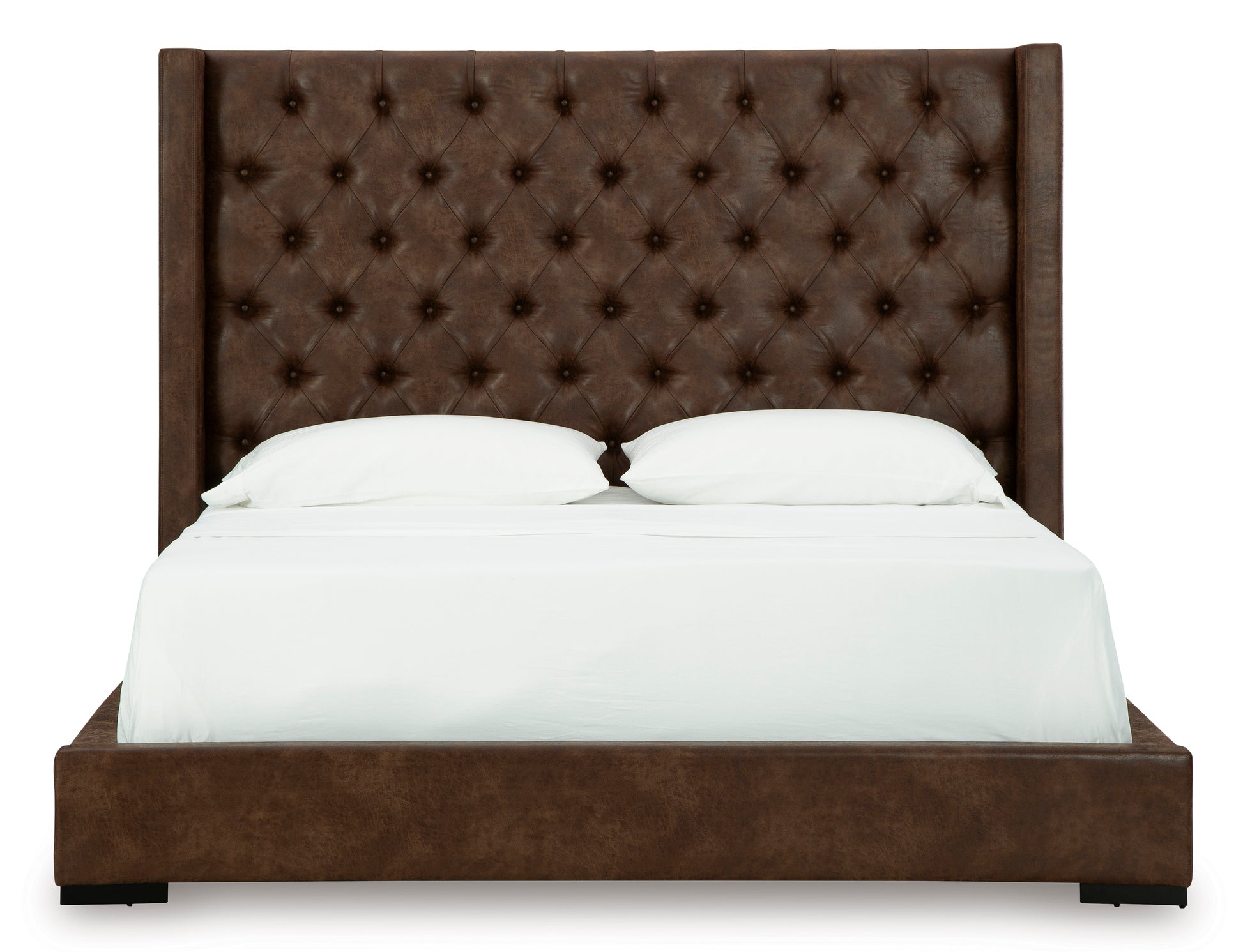 King Upholstered Bed,,Includes upholstered headboard, footboard and rails;Made with engineered wood frames and foam;Faux leather upholstery;Foundation/box spring required, sold separately;Mattress available, sold separately;Assembly required