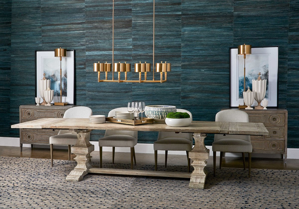 Made of 100% recycled pine, this grand farmhouse table features a slatted top finished with breadboard ends, atop carved balusters, distressed and rubbed with a subtle off white wash resting in the cracks and natural recesses. Includes two 18 inch leaves that can be removed to create a 96" table. Solid wood will continue to move with temperature and humidity changes, which can result in small cracks and uneven surfaces, adding to its authenticity and character.