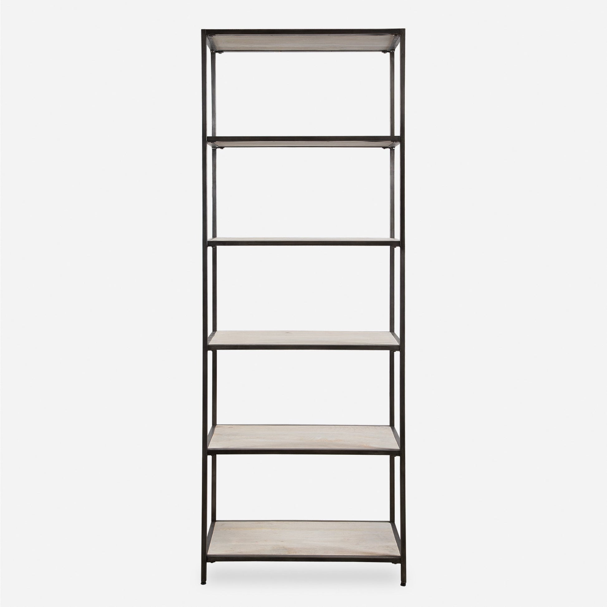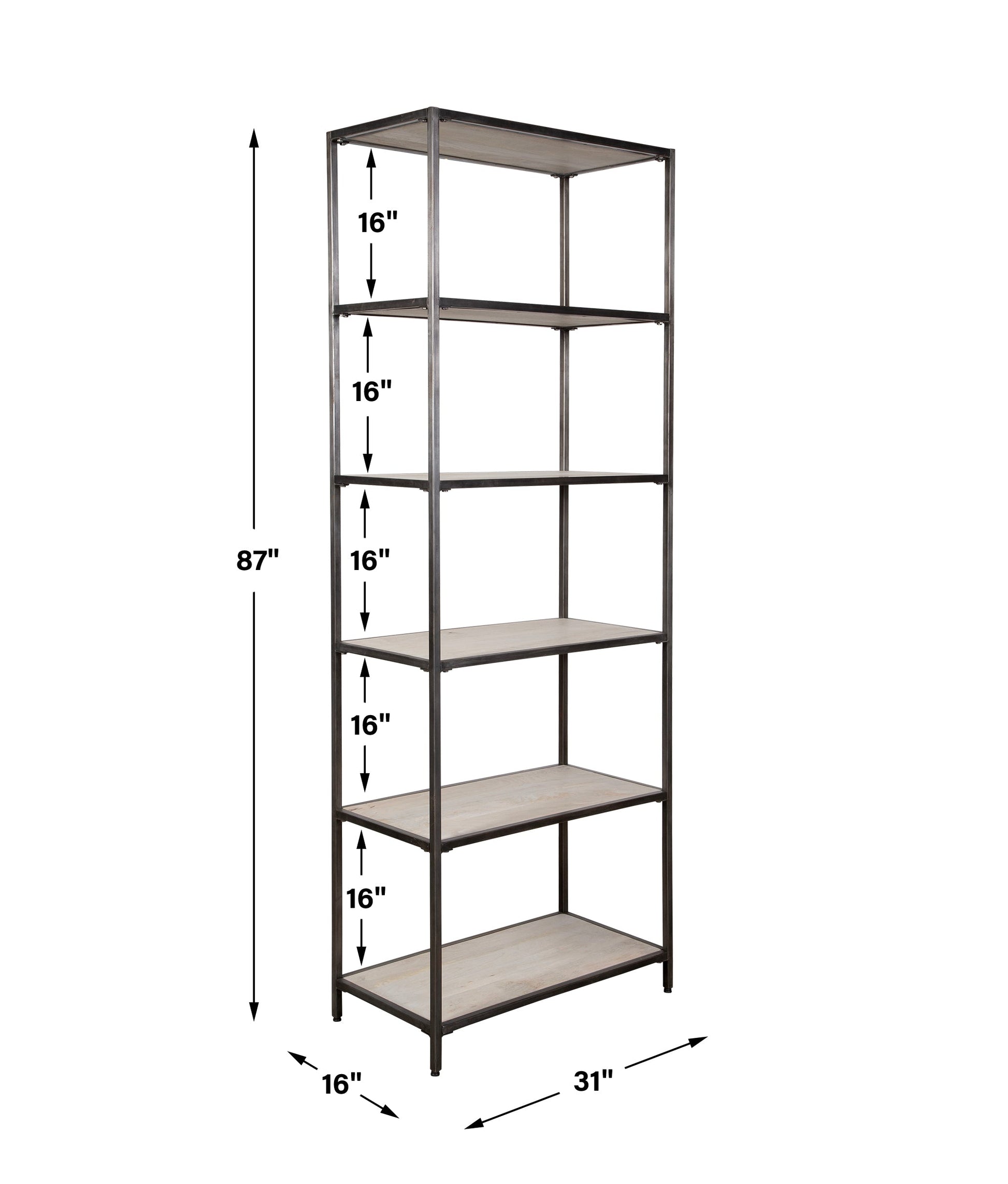 Boasting with display space, the Baldwin Etagere is a versatile and streamlined piece that has a place in any home. The iron frame is finished in clean gunmetal with 5 shelves in white washed mango wood. Distance between shelves is 16".Item Dimension (cm ) :
