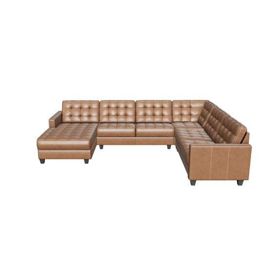 Includes 4 pieces: left-arm facing corner chaise, armless loveseat, right-arm facing loveseat and wedge;"Left-arm" and "right-arm" describe the position of the arm when you face the piece;Corner-blocked frame;Attached back and loose seat cushions;High-resiliency foam cushions wrapped in thick poly fiber;Genuine leather typically covers inside areas such as the back, seat and arm cushions; skillfully matched faux leather covers the remaining areas ;Due to its natural origin, real leather can show individual characteristics such as healed scars, growth marks, grain variation and shade variation ;Natural variations make each hide unique and do not detract from the wearing qualities of leather;Exposed feet with faux wood finish;Platform foundation system resists sagging 3x better than spring system after 20,000 testing cycles by providing more even support;Smooth platform foundation maintains tight, wrinkle-free look without dips or sags that can occur over time with sinuous spring foundations