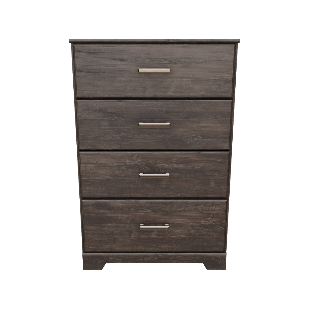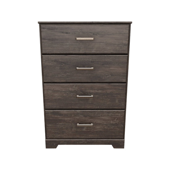 With its clean-lined look and modern attitude, the Belachime chest of drawers is a fresh style awakening. A warm charcoal hue over replicated oak grain easily complements other furniture finishes. Smooth drawer fronts with antiqued pewter-tone handles complete the aesthetic.