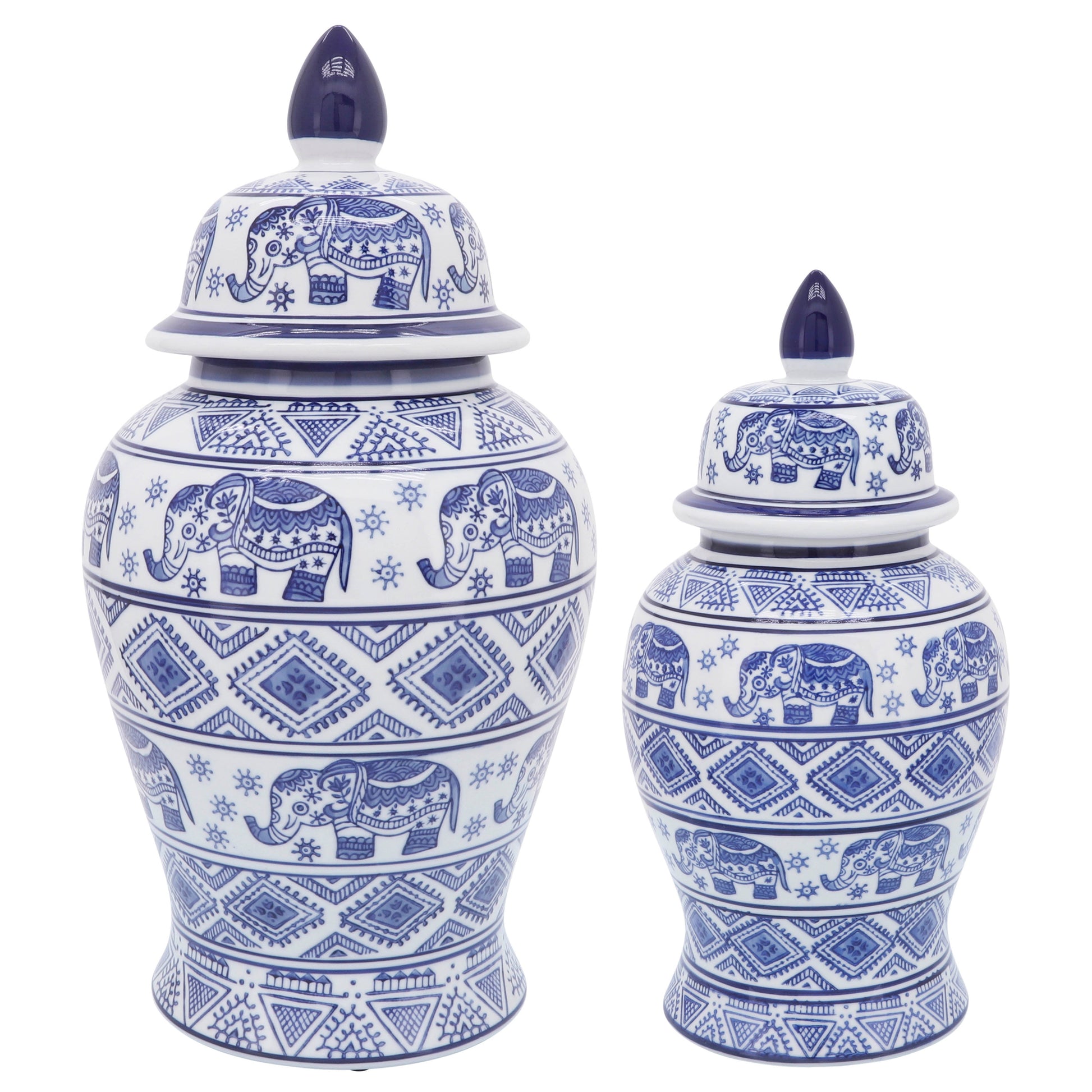 CER, 18"H ELEPHANT TEMPLE JAR, WHT/BLU