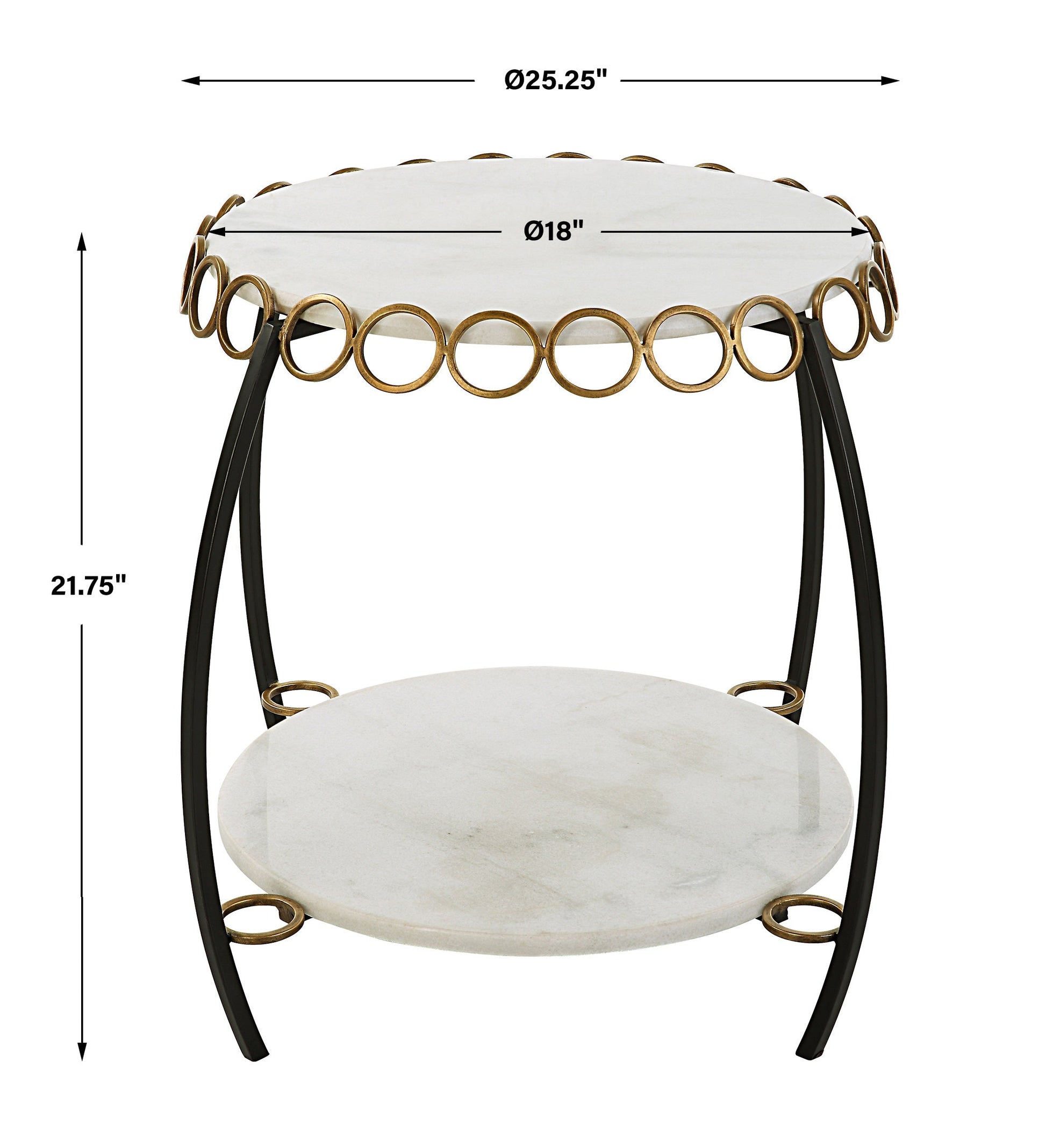 Shelves of honed white marble are decorated with antique gold ringlets with gracefully arched iron legs in matte black. True to the nature of natural materials, each piece will have unique marbling and veining throughout.Item Dimension (cm ) :