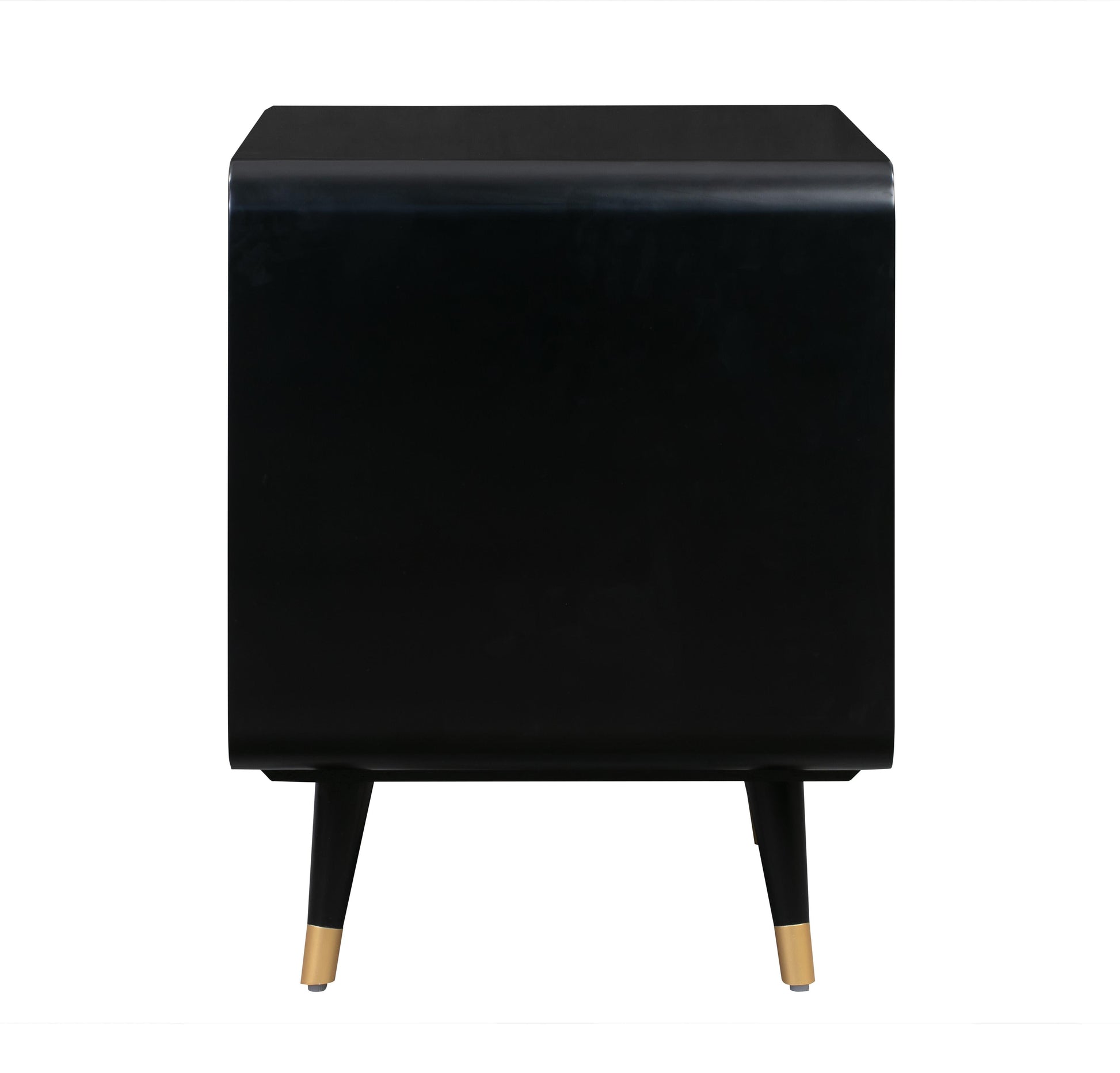 Drawing inspiration from the ever classic mid-century style, the Christine nightstand adds a retro look to any space its placed. This nightstand features spacious drawers, a black Acacia finish embellished with cane webbing and conical legs to complete the look.
