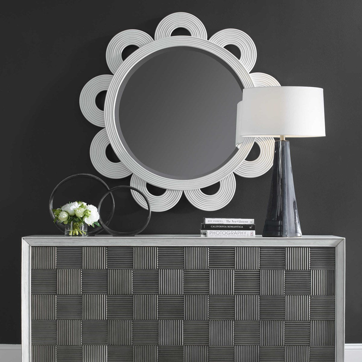 Crafted entirely from natural rattan, the Clematis Round adds a touch of natural texture and coastal appeal that features a solid white finish. Mirror features a 3/4" bevel.Item Dimension (cm ) :
