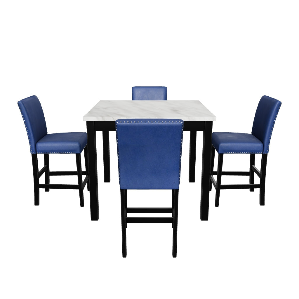 Curate a dining nook brimming with the glamourous contemporary style you love with the Cranderlyn counter height dining set. Replicated Carrara marble laminate gives the tabletop a glam appeal, balanced by a matte black base. Four counter height bar stools, with sumptuous blue velvet upholstery and polished nailhead trim, complete the set.
