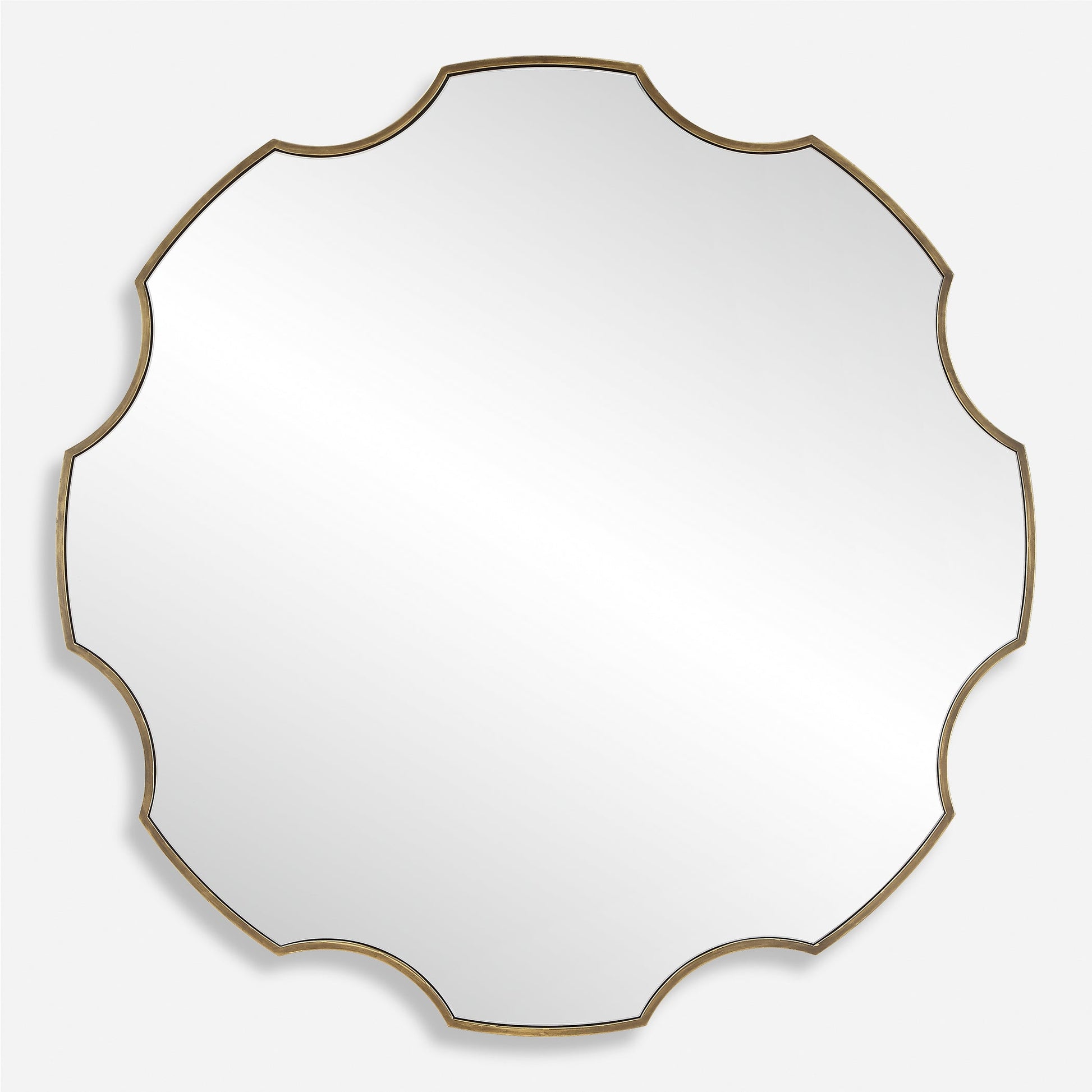 Our Gear-shaped Mirror Boast An Iron Frame With A Channeled Side And A Richly Antiqued Golden Bronze Finish. Its Distinctive Silhouette Encases A Floating Polished Edged Mirror, Creating A Blend Of Vintage Charm With Modern Allure.