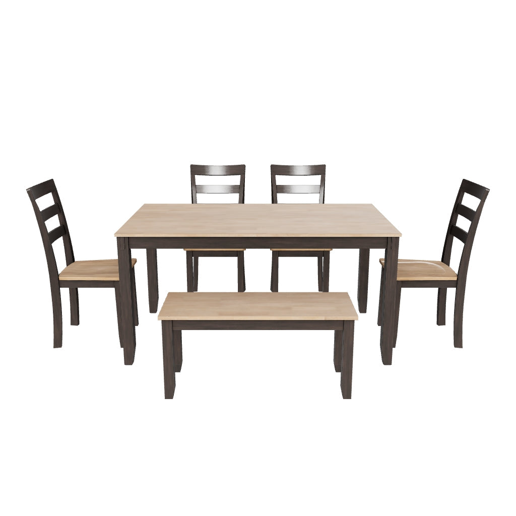 Wood Products and Other, Dining Room Table Set (6/CN), , Includes dining table, 4 chairs and bench;Tabletop made with rubberwood solids, butcher block mango veneer top and MDF substrate;Chair and bench made with wood;2-tone finish (tabletop, chair seats and bench seat with light natural mango wood finish; table base and chair frames with dark brown finish);Table with tapered legs and through tenon look;Chair with contoured seat and ladderback design;Bench with through tenon look;Seats up to 6;Assembly required