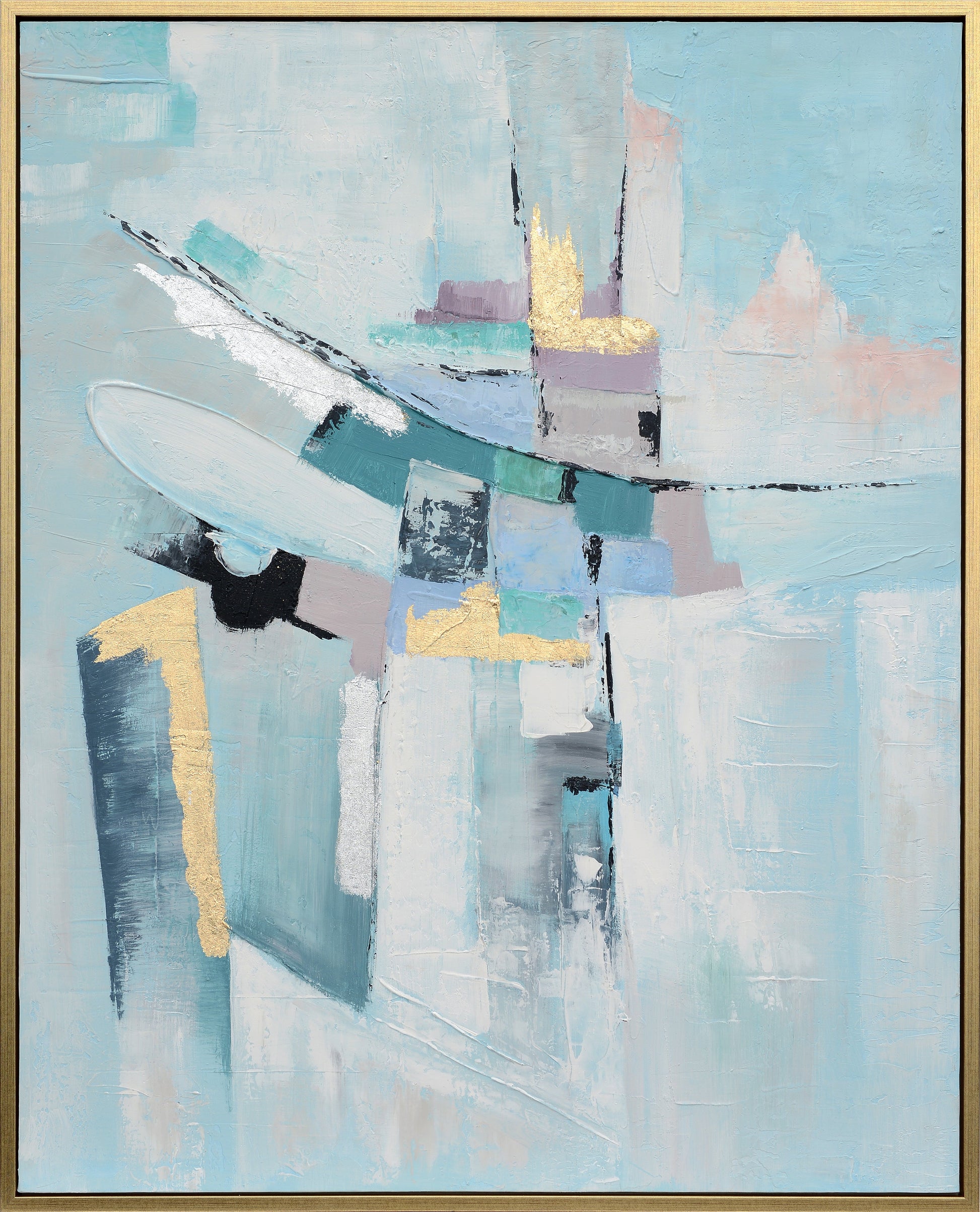 This 41.6 x 51.6 inch handmade oil painting is a captivating abstract piece with a dynamic mix of colors and textures. The canvas is dominated by a large, swirling shape in shades of gold, orange, and red, its edges blending seamlessly into the background. This central form seems to radiate energy outwards, with bold strokes of blue, black, and white adding to the sense of movement and depth. The overall impression is one of vibrancy, energy, and artistic expression.