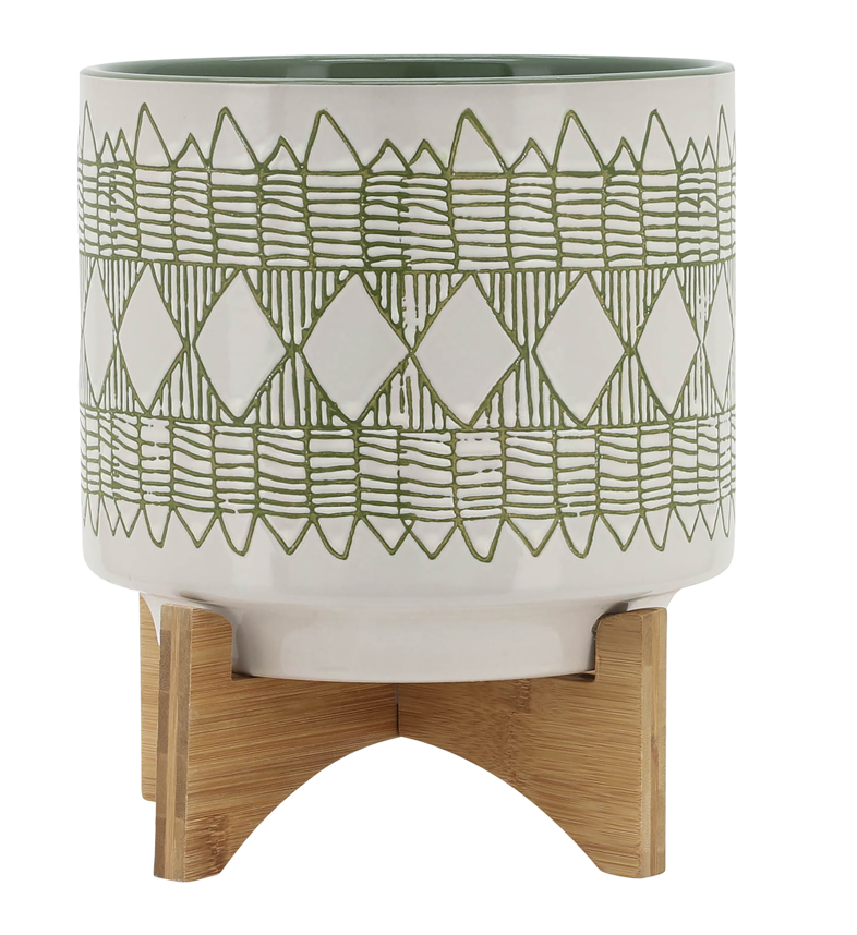 Details & OverviewCERAMIC 10" AZTEC PLANTER ON WOODEN STAND, OLIVE