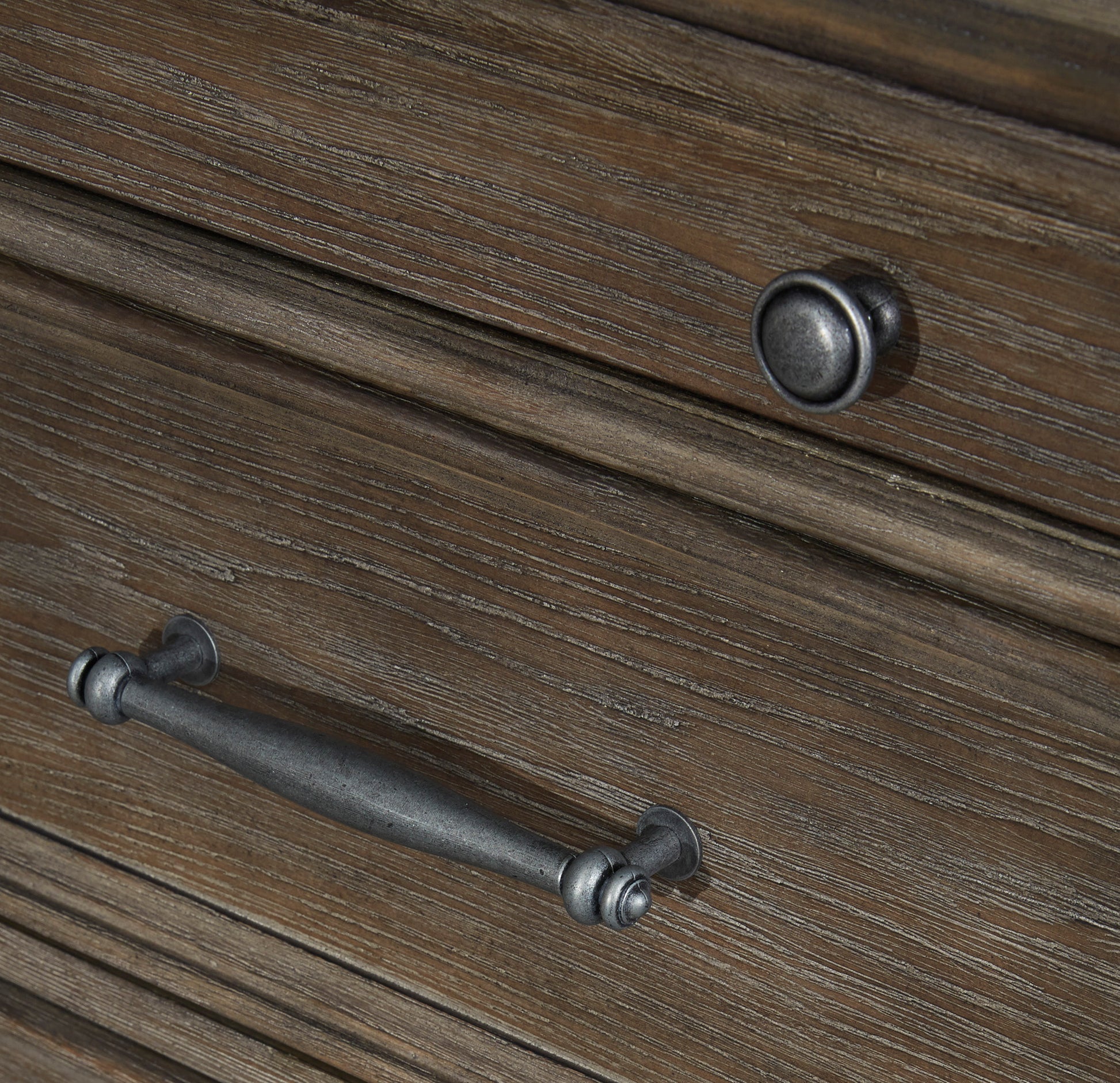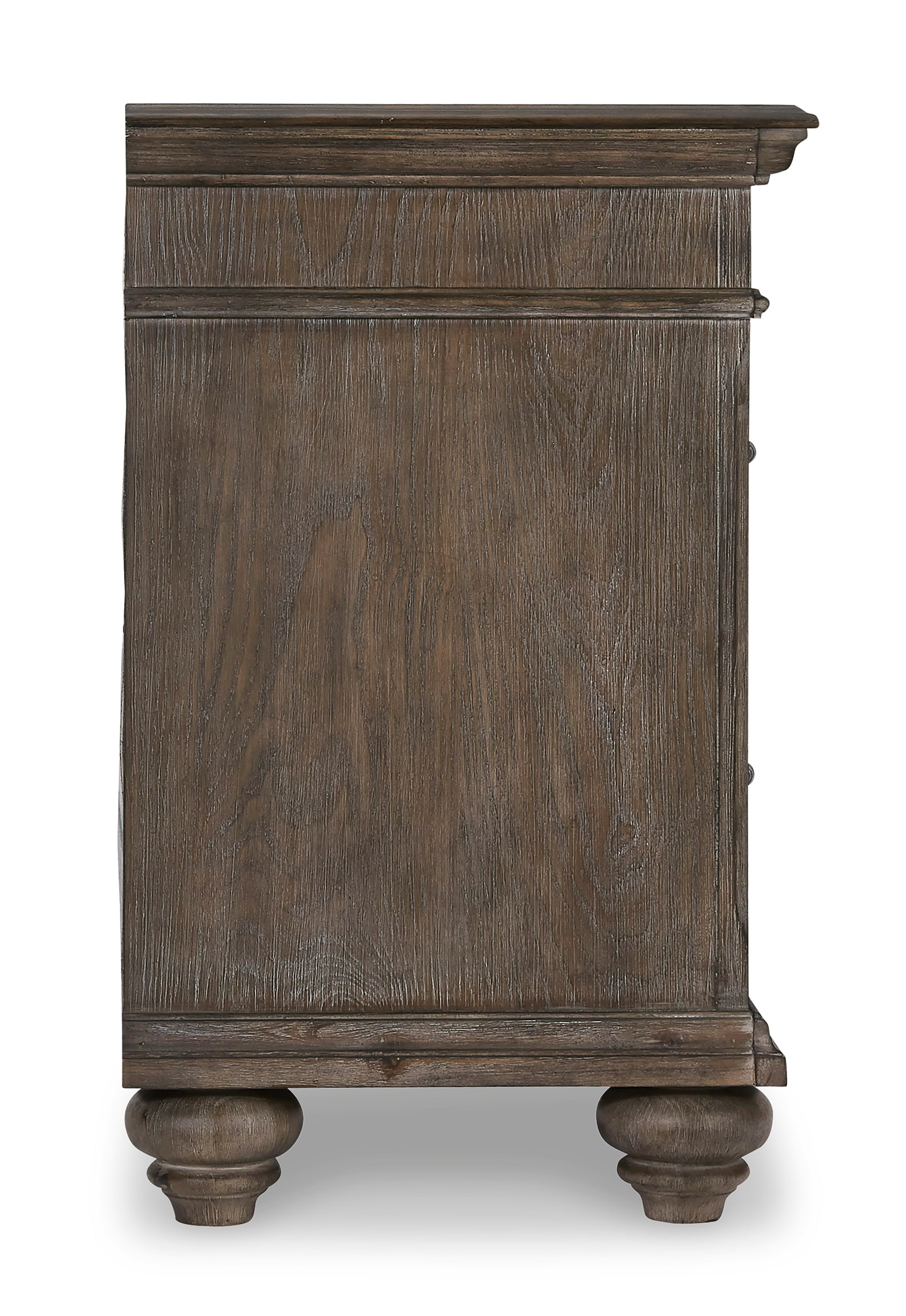 Homey. Hearty. Heavenly hued. Luring with a distressed weathered gray finish and substantial mouldings for great presence, this nightstand is sure to make your homestead feel that much more like home. Solid wood is beautified with elm veneers for a master suite masterpiece made for years of satisfaction. Dark pewter-tone nailhead trim adds to the richly rustic aesthetic.