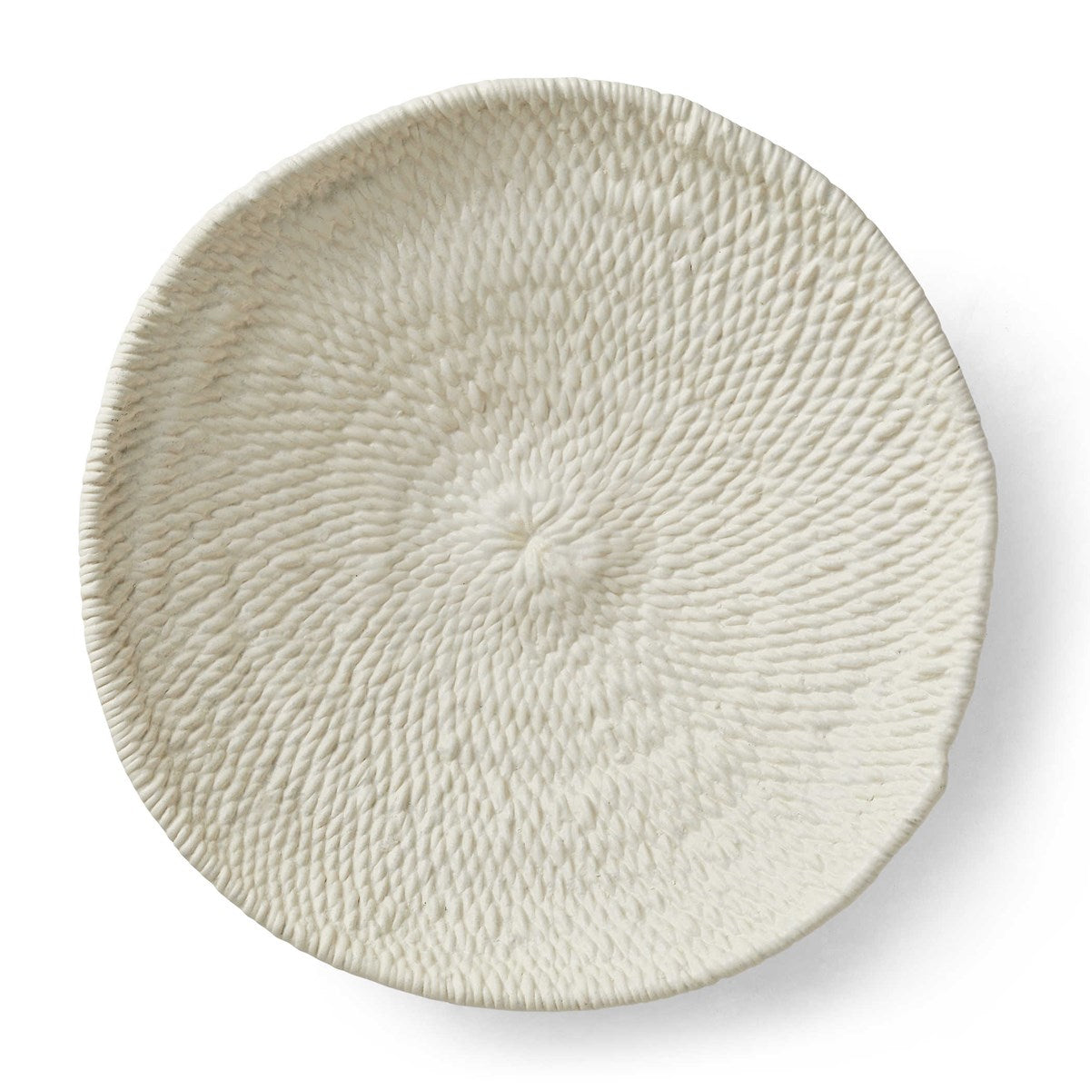 Rich in texture and detail, this ceramic bowl was molded from an authentic wicker basket. A subtle matte white pumice glaze enhances the texture and lends to the impression of lost family relics rediscovered. May be hung on the wall or used as a tabletop accessory.