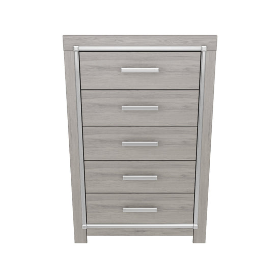 Reminiscent of Hollywood glamour of yesteryear, the Lodanna chest of drawers interprets luxury in a decidedly modern way. A dazzling gray finish and faceted chrome-tone accents enhance the star power. Five smooth-gliding drawers provide enough storage to appease your inner diva.