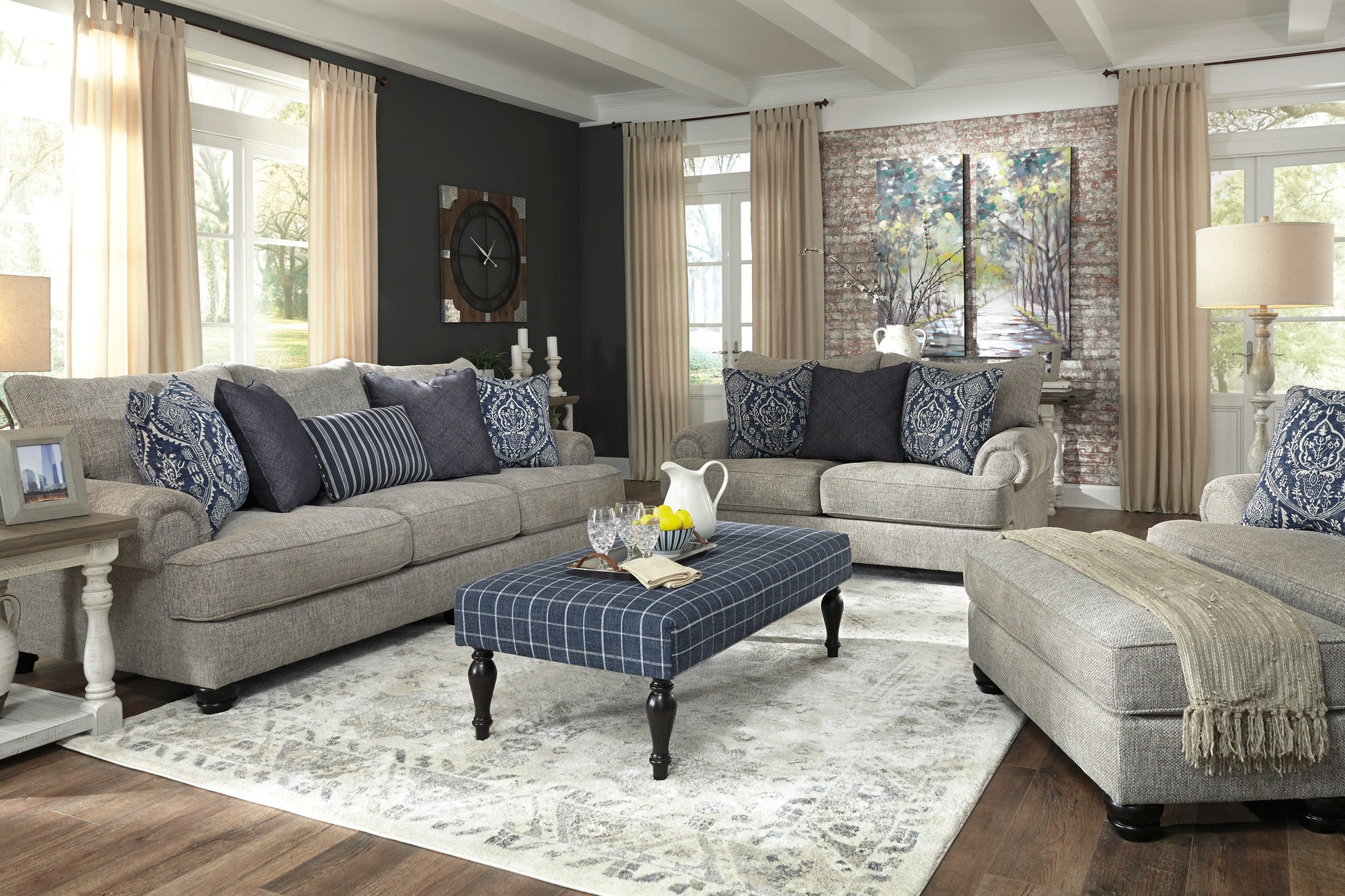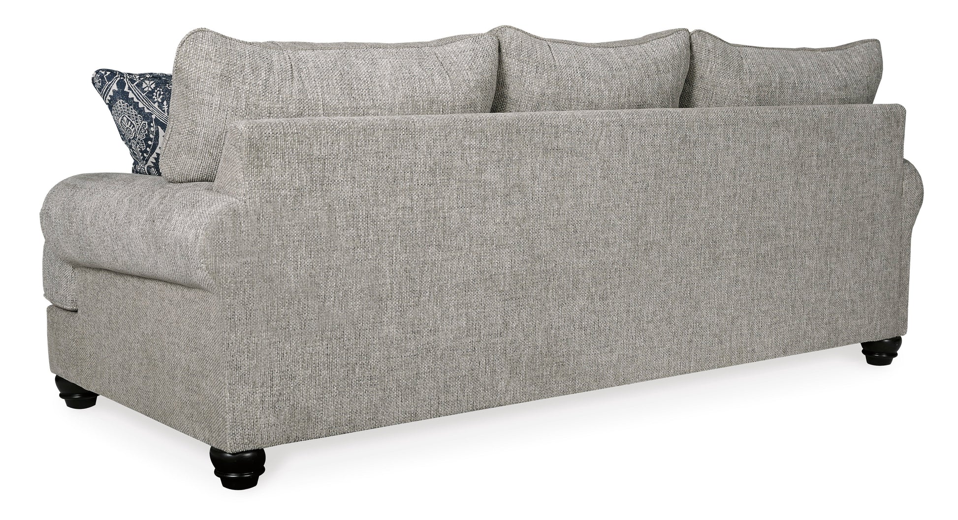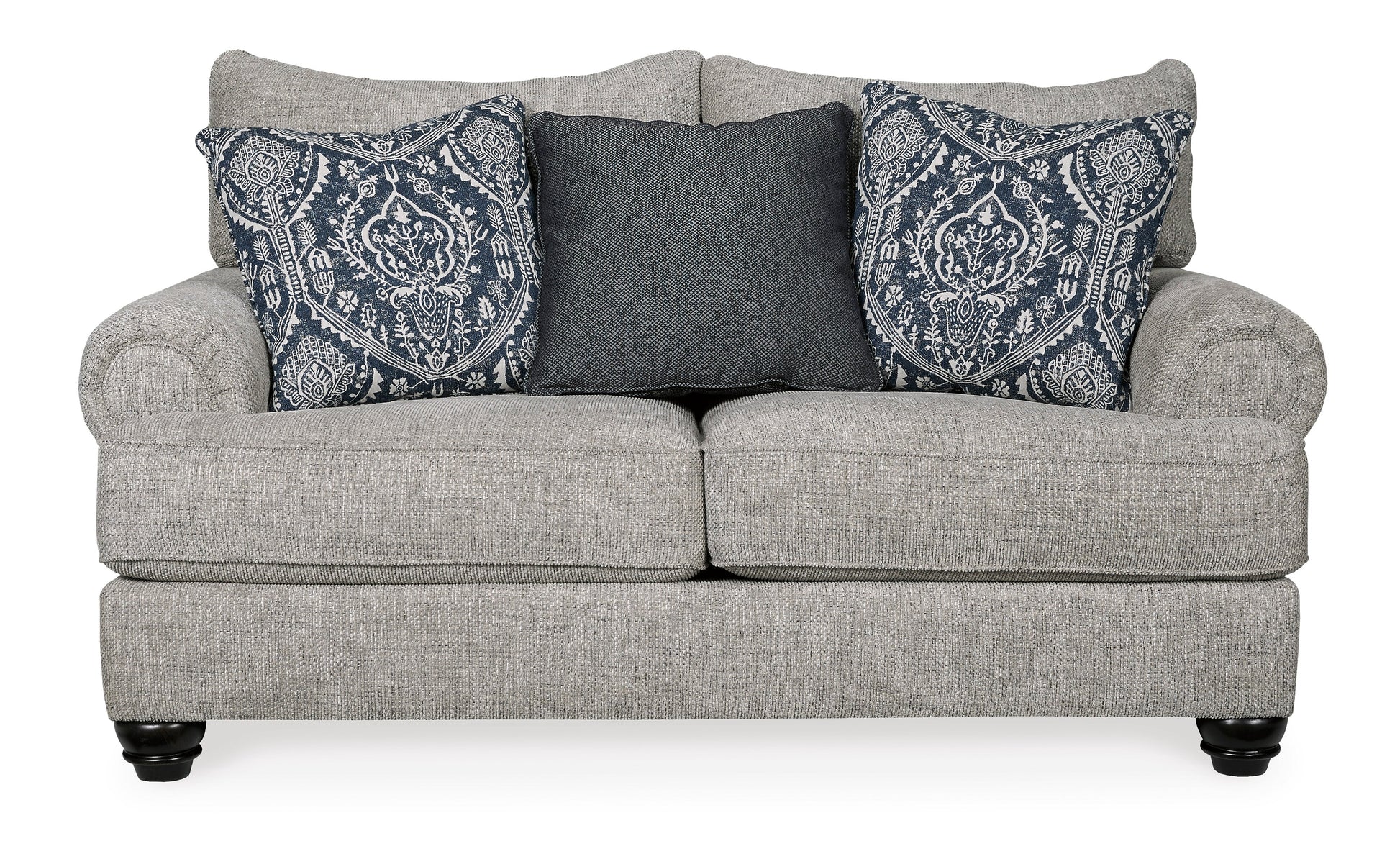 A triumph in transitional design, the Morren loveseat invites you to indulge in eye-catching texture and cozy comfort. Flared roll arms and loose, reversible Cushion give this classically styled loveseat a sense of everyday ease. Soothing blue-hue accent pillows add a wonderful layer of interest.