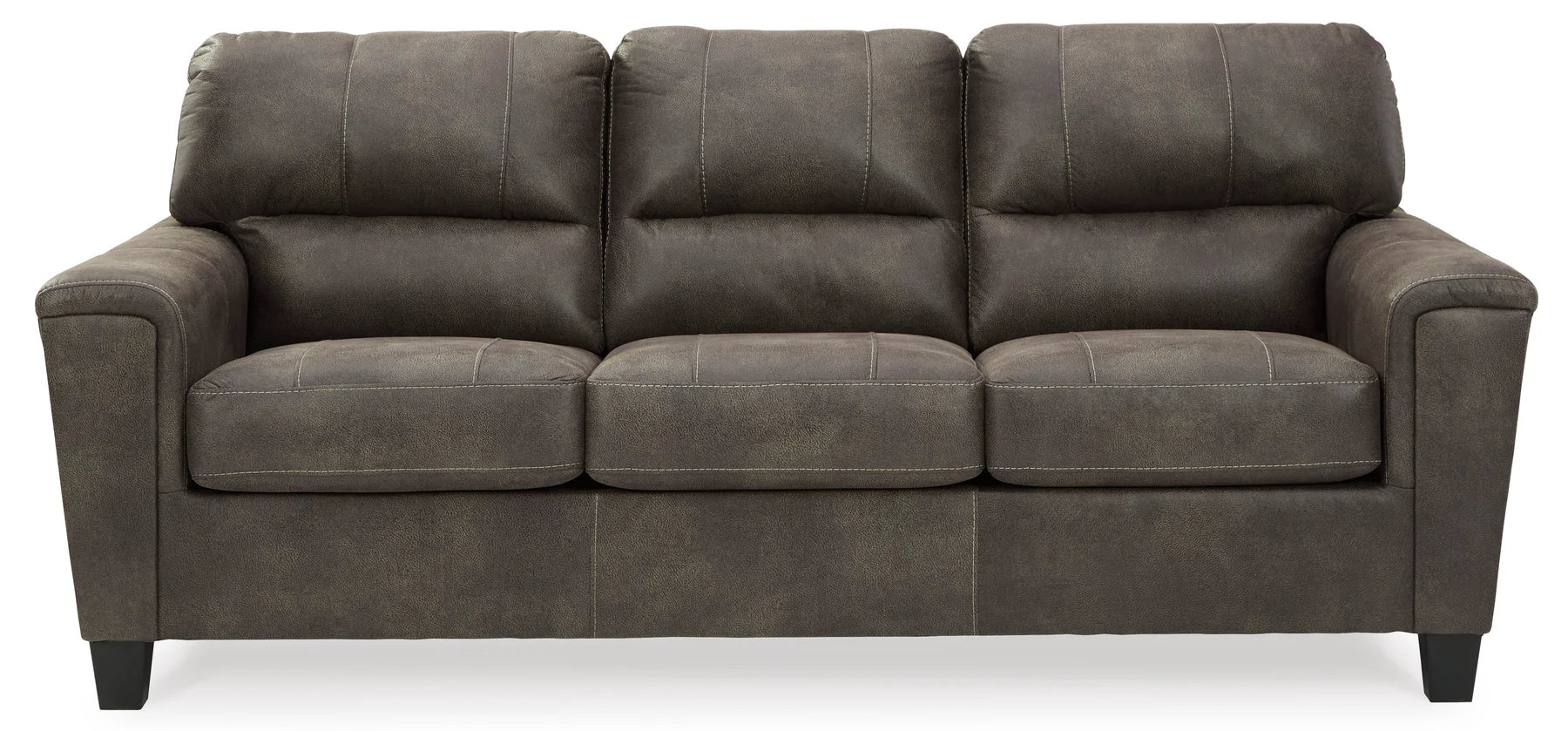 If you love the cool look of leather but long for the warm feel of fabric, you can take comfort in the Navi sofa. Wrapped in a fabulous faux leather with a weathered hue and hint of pebbly texture to resemble the real deal, this decidedly modern sofa proves less is more. Elements include angled side profiling and track armrests wrapped with a layer of pillowy softness for that little something extra. Prominent jumbo stitching and clean-lined divided back styling lend fashion-forward flair.