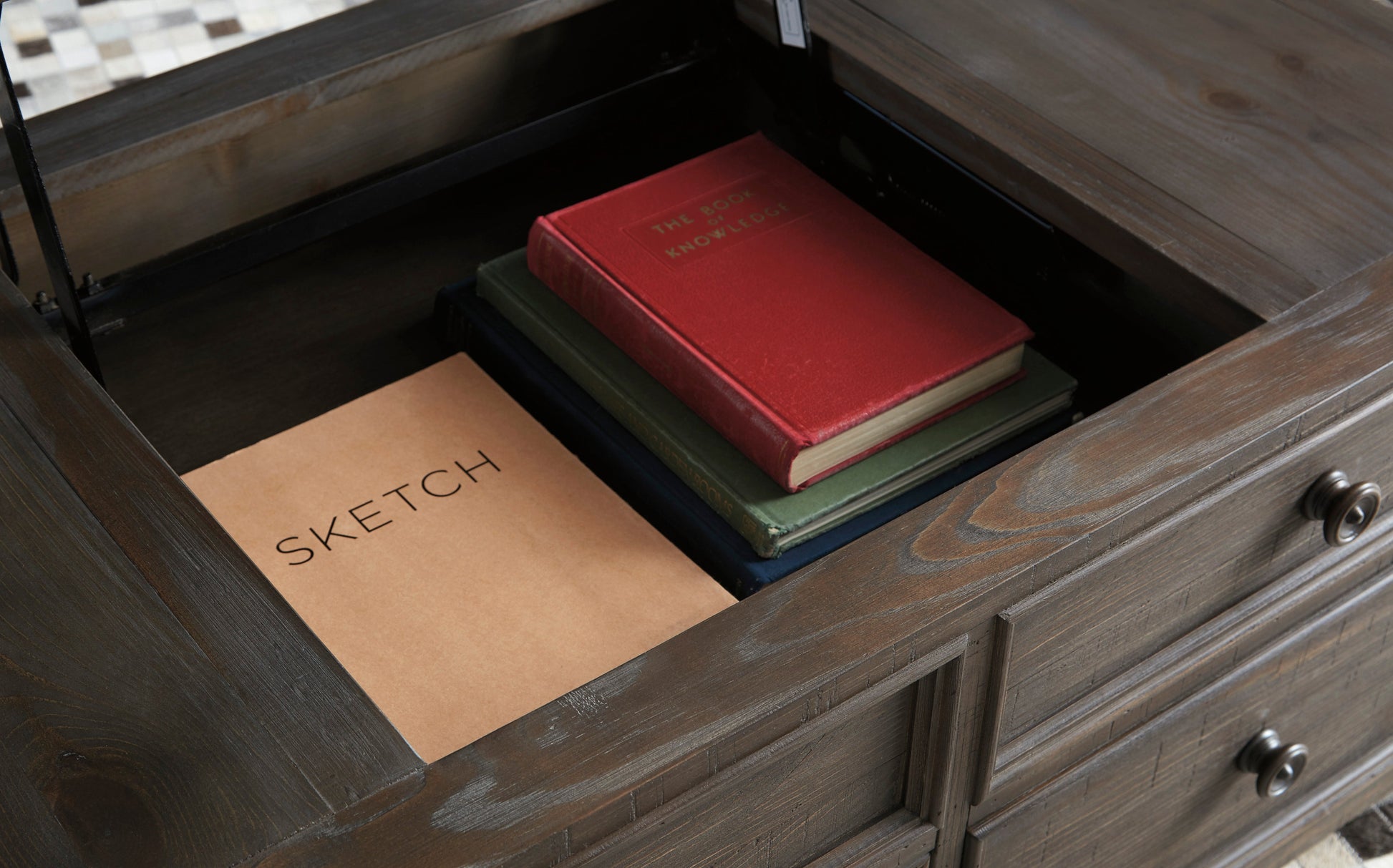 Inspired by heavy and hearty lodge-style furnishings from days gone by, the Wyndahl lift top coffee table brings the past brilliantly into the present. Distinctive details include robust mouldings, raised drawer fronts for rich dimension and a distressed aged pine color finish with light wire-brushed texture that’s pure artistry. The table’s spring lift top—perfect for impromptu meals and laptop work—makes this yesteryear-inspired piece made for the here and now.