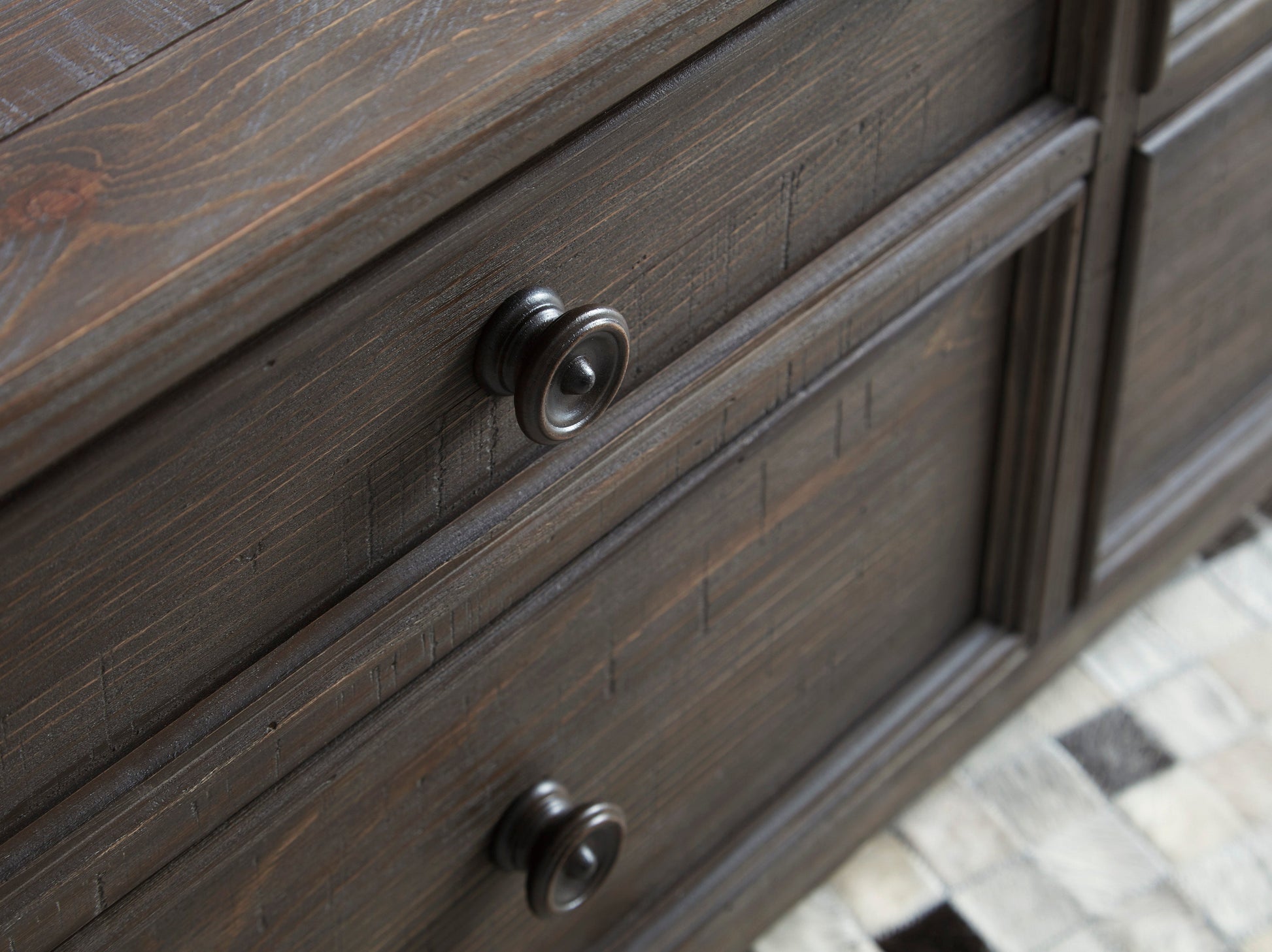 Made of pine wood, veneers and engineered wood;Distressed finish;Single display shelf;Smooth-gliding drawer with dovetail construction;Assembly required
