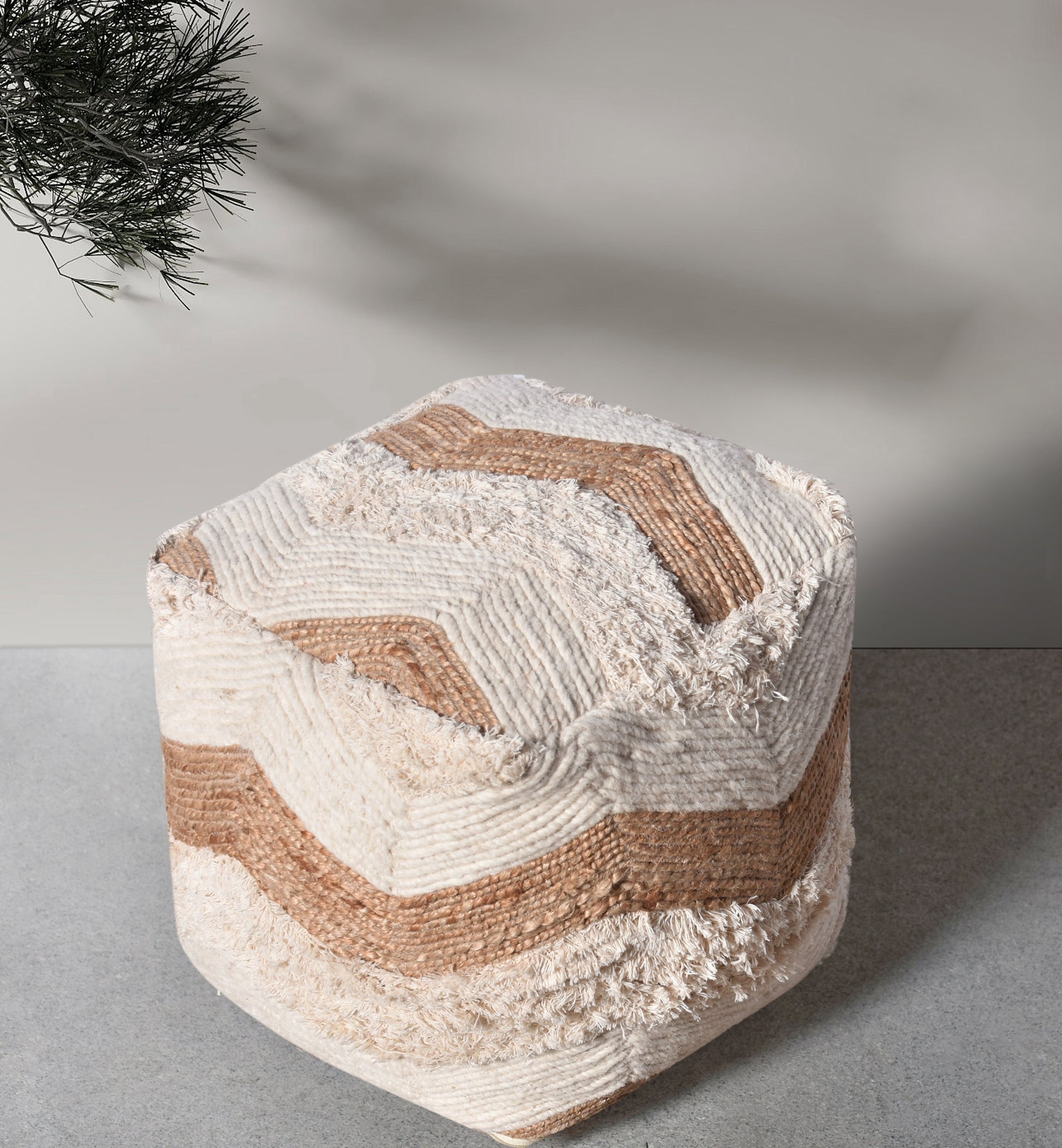 Introducing the Olaine Pouf, a stunning blend of jute, wool, and cotton salvage. Handcrafted with care, this natural and ivory-colored pouf exudes organic charm. Use it as a seat, footrest, or side table. Experience sustainable craftsmanship with the versatile Olaine Pouf