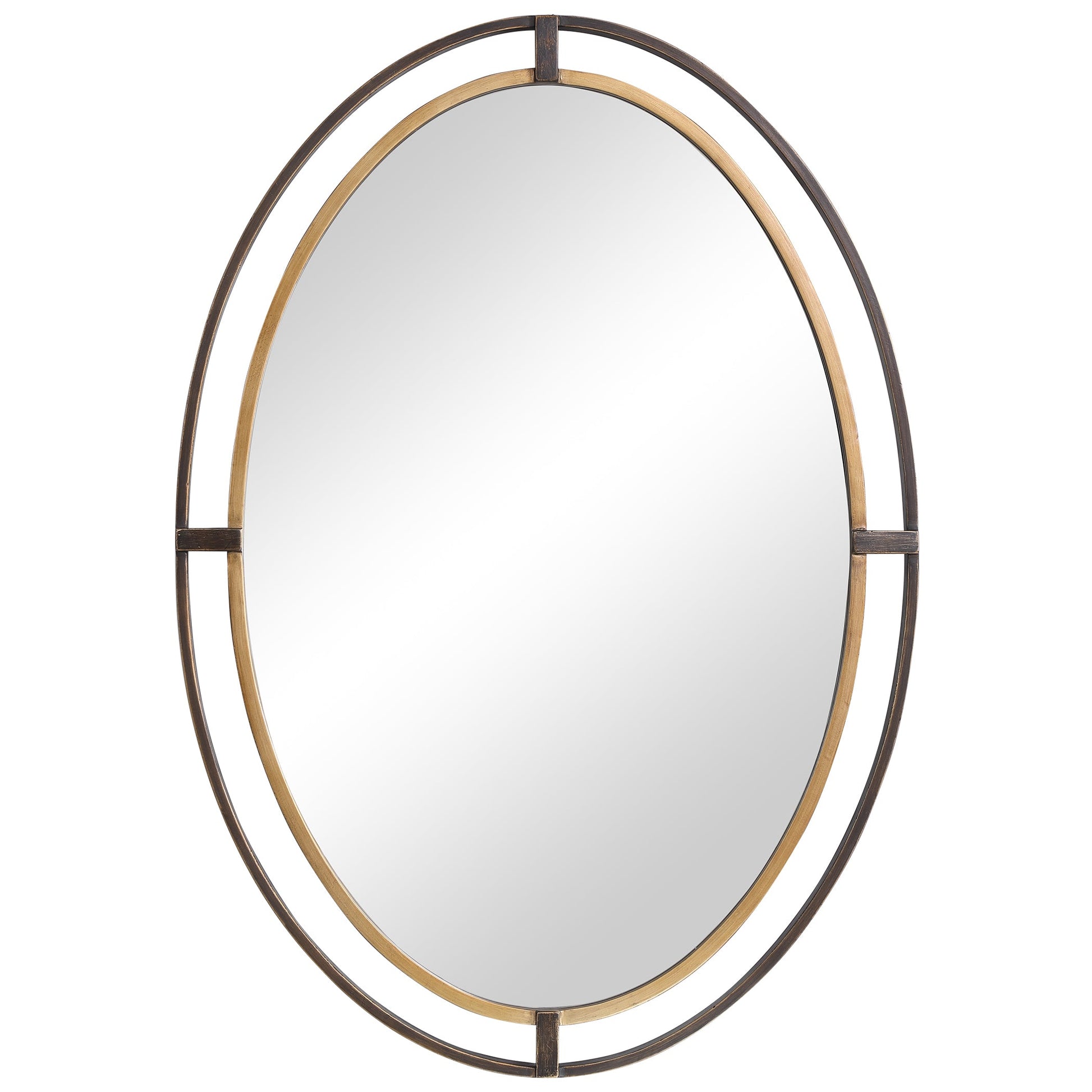 Details & OverviewThis metal oval design features a double frame connected at four points. The outer frame is finished in a distressed rustic bronze, complemented by a lightly antiqued gold inner frame.