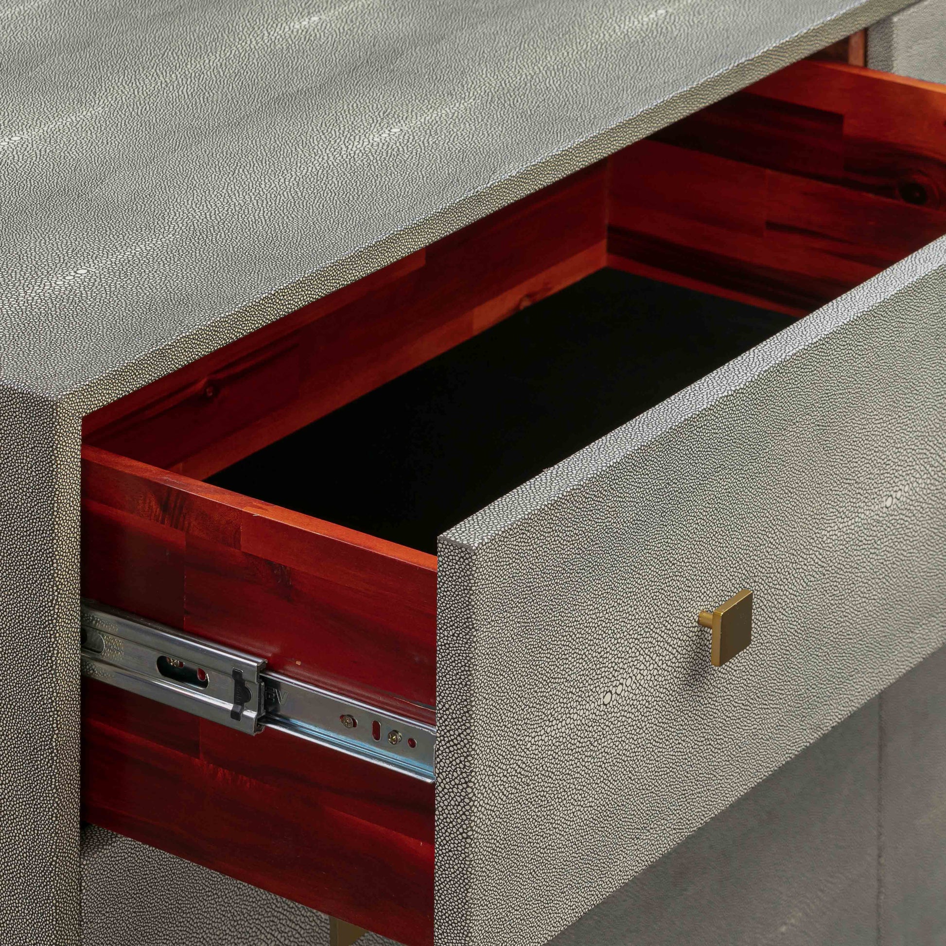 Attention to detail is perfectly displayed with the Pesce Shagreen collection. Everything from its textured shagreen finish, dramatic brass legs and handles, to the drawers finished in cherry wood come together beautifully to provide elegance and contemporary style to your space.