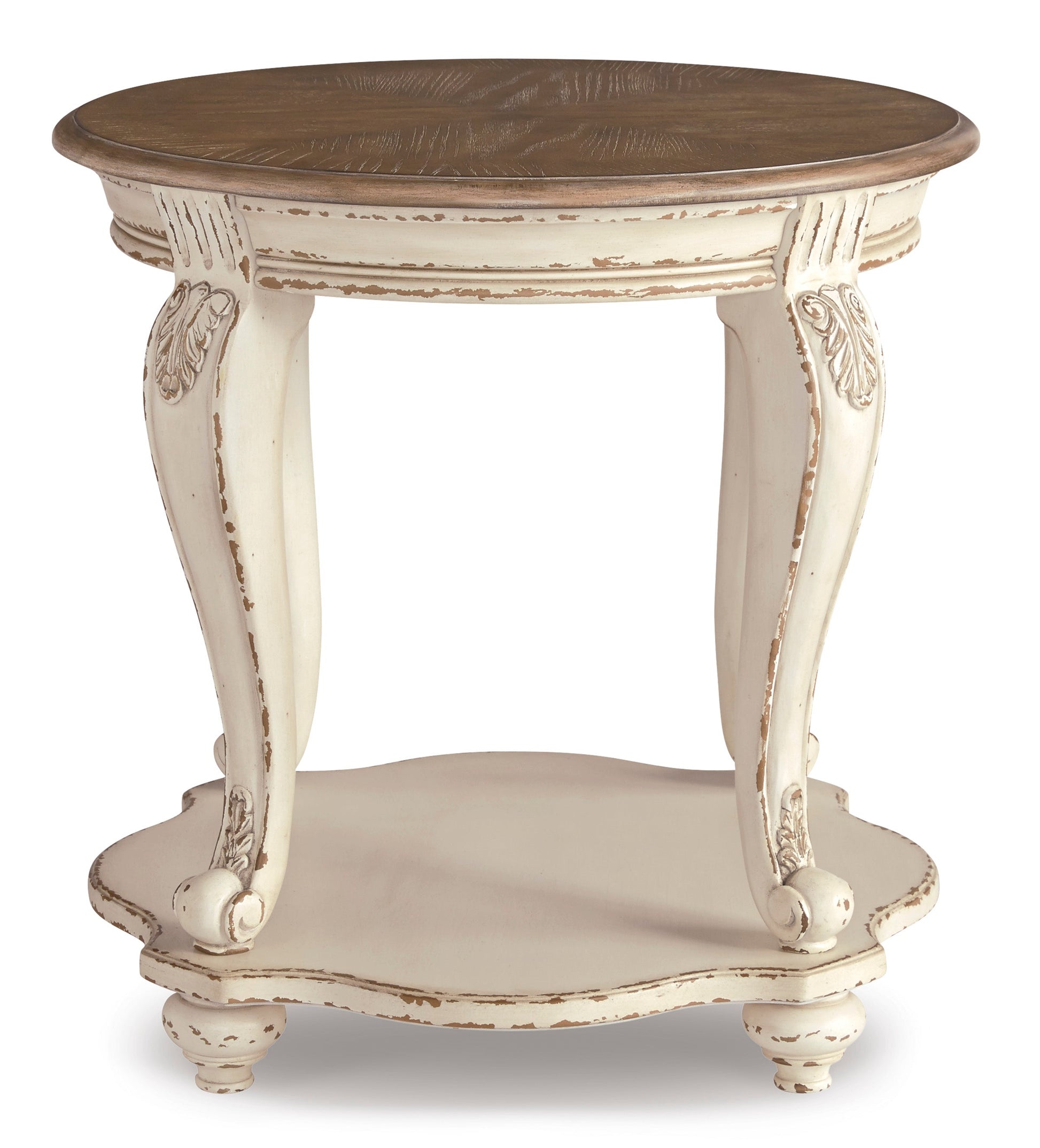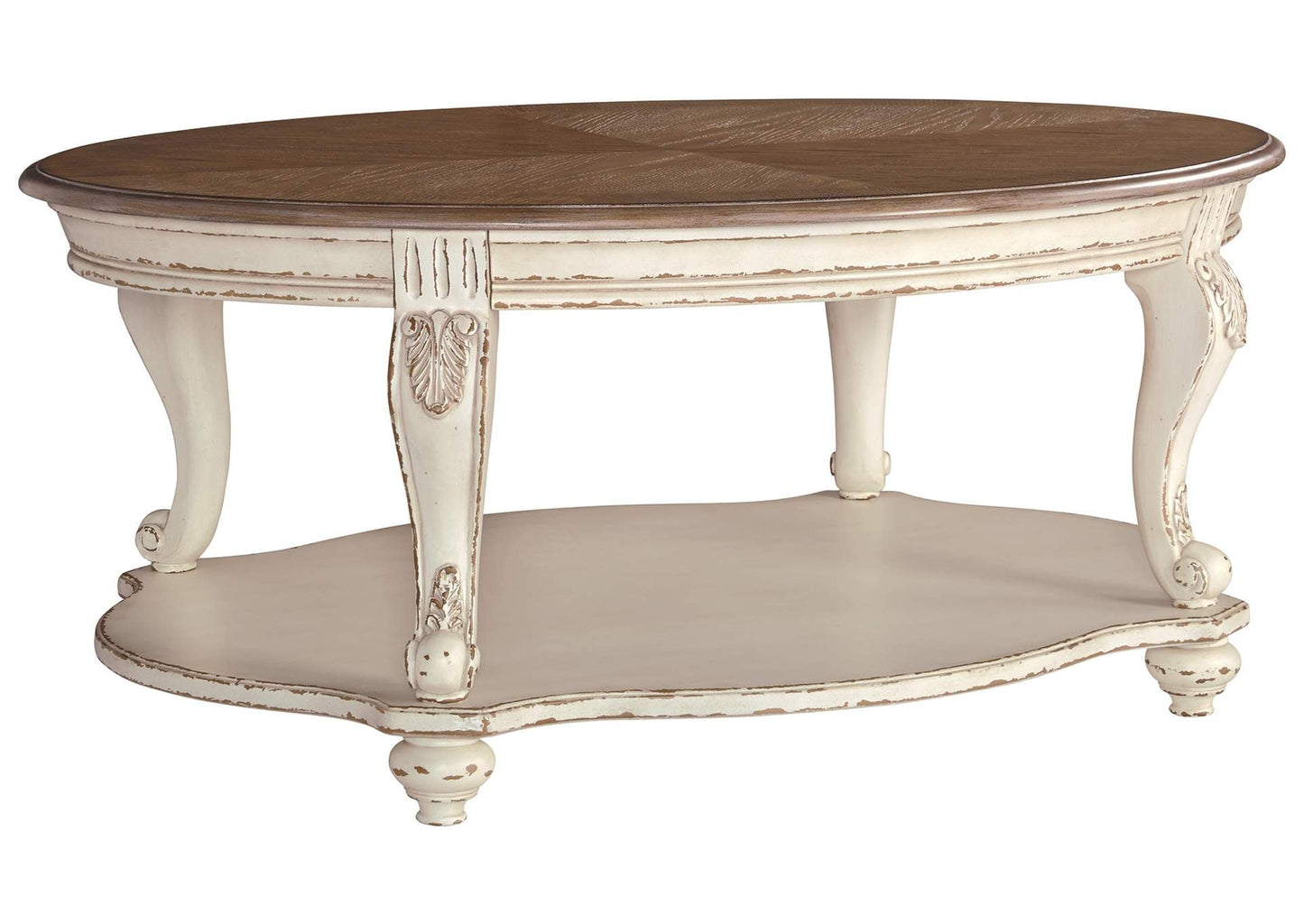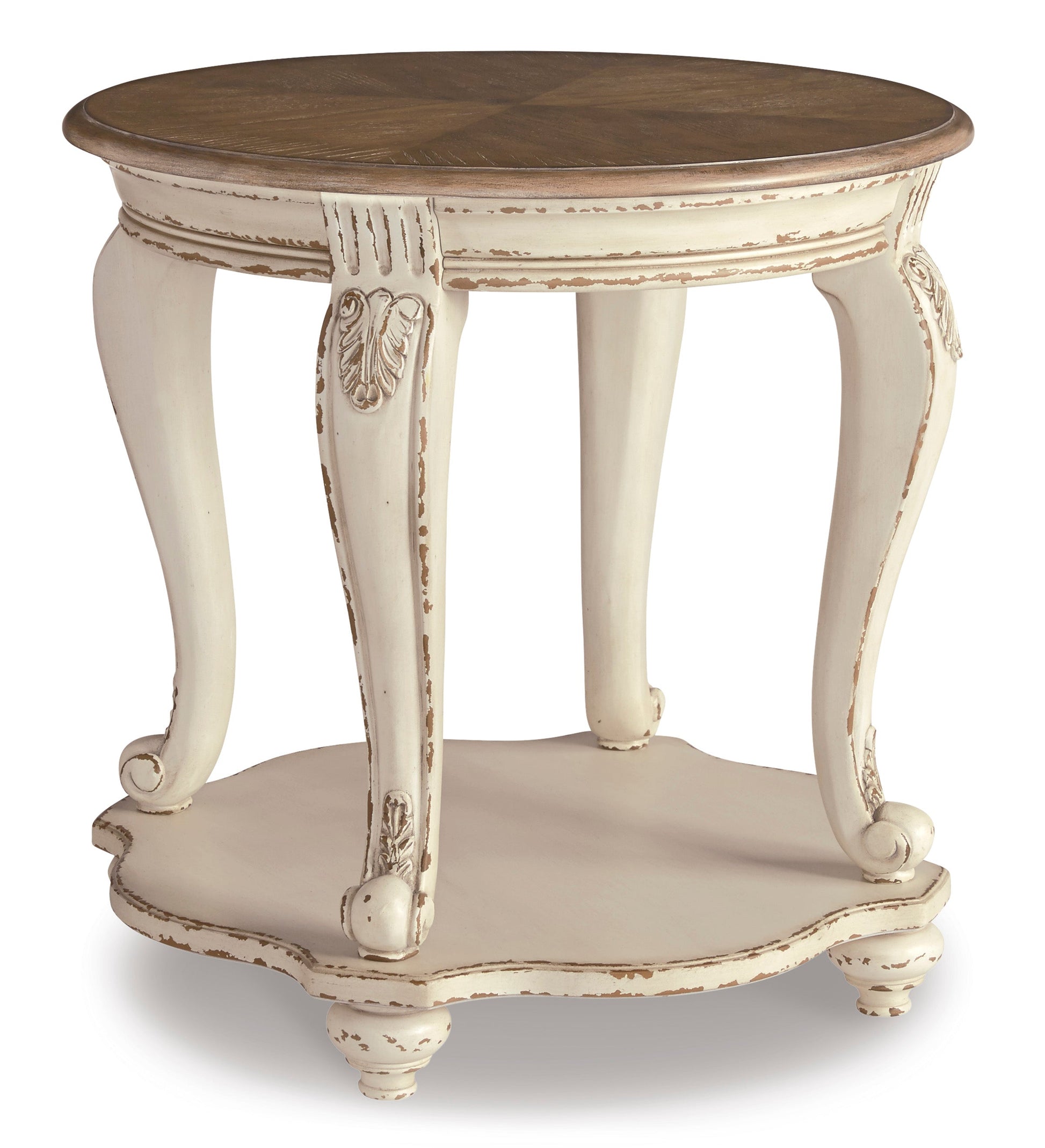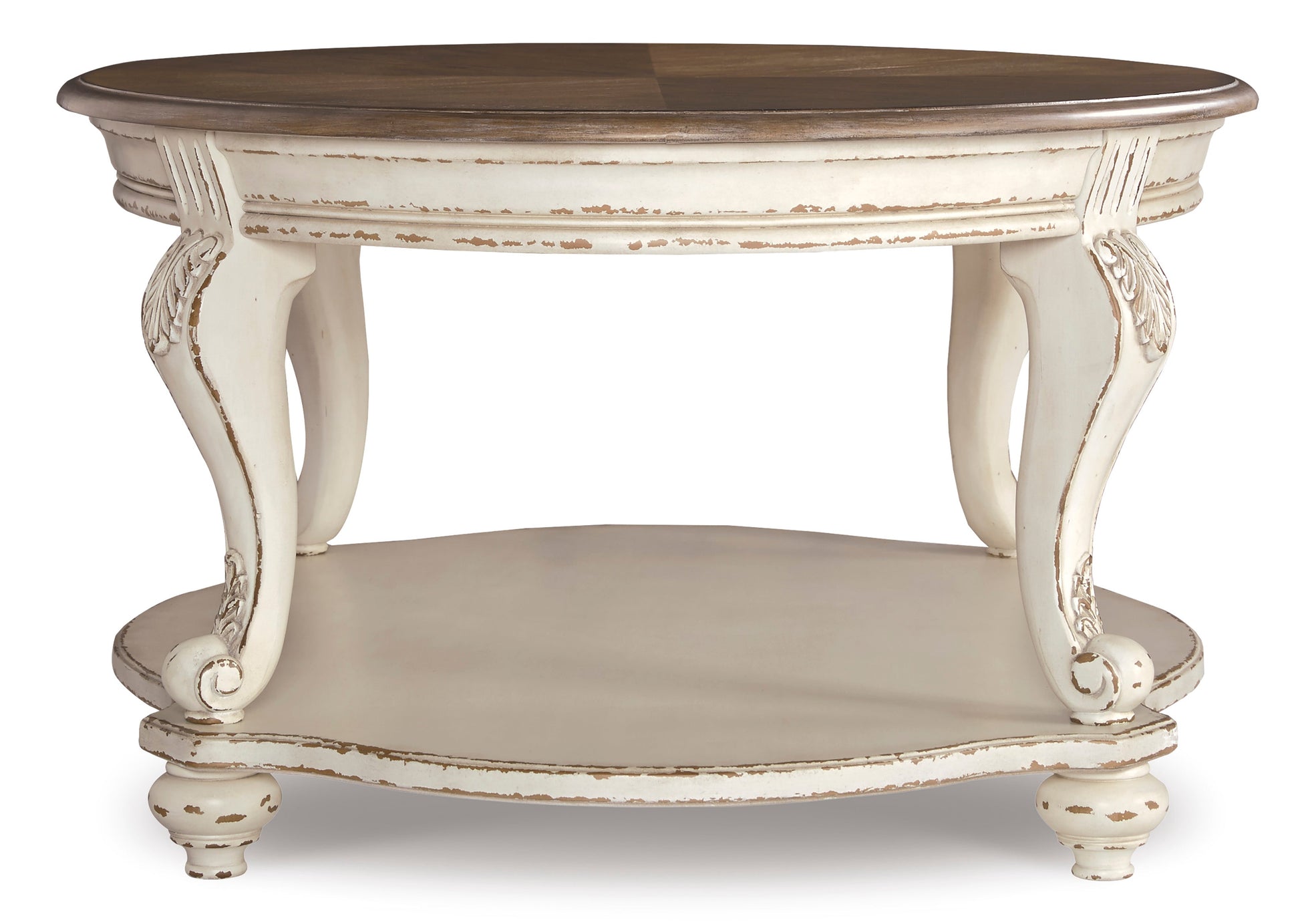 Elevating the art of traditional cottage styling, this occasional table set is sure to serve you beautifully for years to come. Antiqued two-tone aesthetic blends a chipped white with a distressed wood finished top for added charm. Classic cabriole legs and shapely lower shelf are a lovely twist. Decorative corbels add refinement.