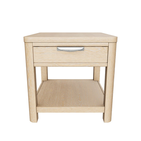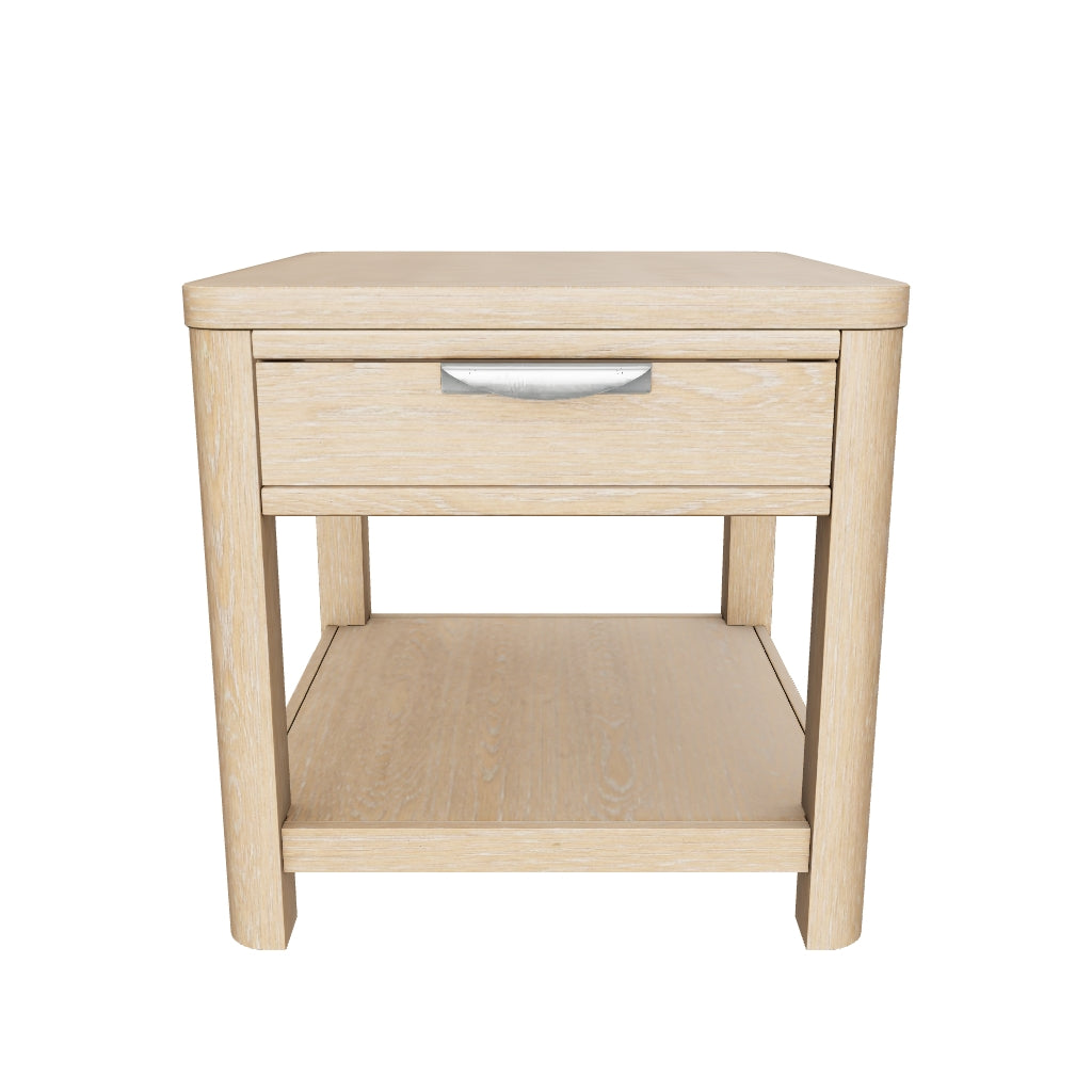 Made with rubberwood solids, oak veneer and MDF substrates;Light oak finish with light wire-brushed wood grain texture;Bin pulls with silvertone finish;Drawer with fully finished interior, dovetail construction and ball-bearing side glides;Lower shelf;Softly shaped posts;Thick cove profiled top;Assembly required,End Table
