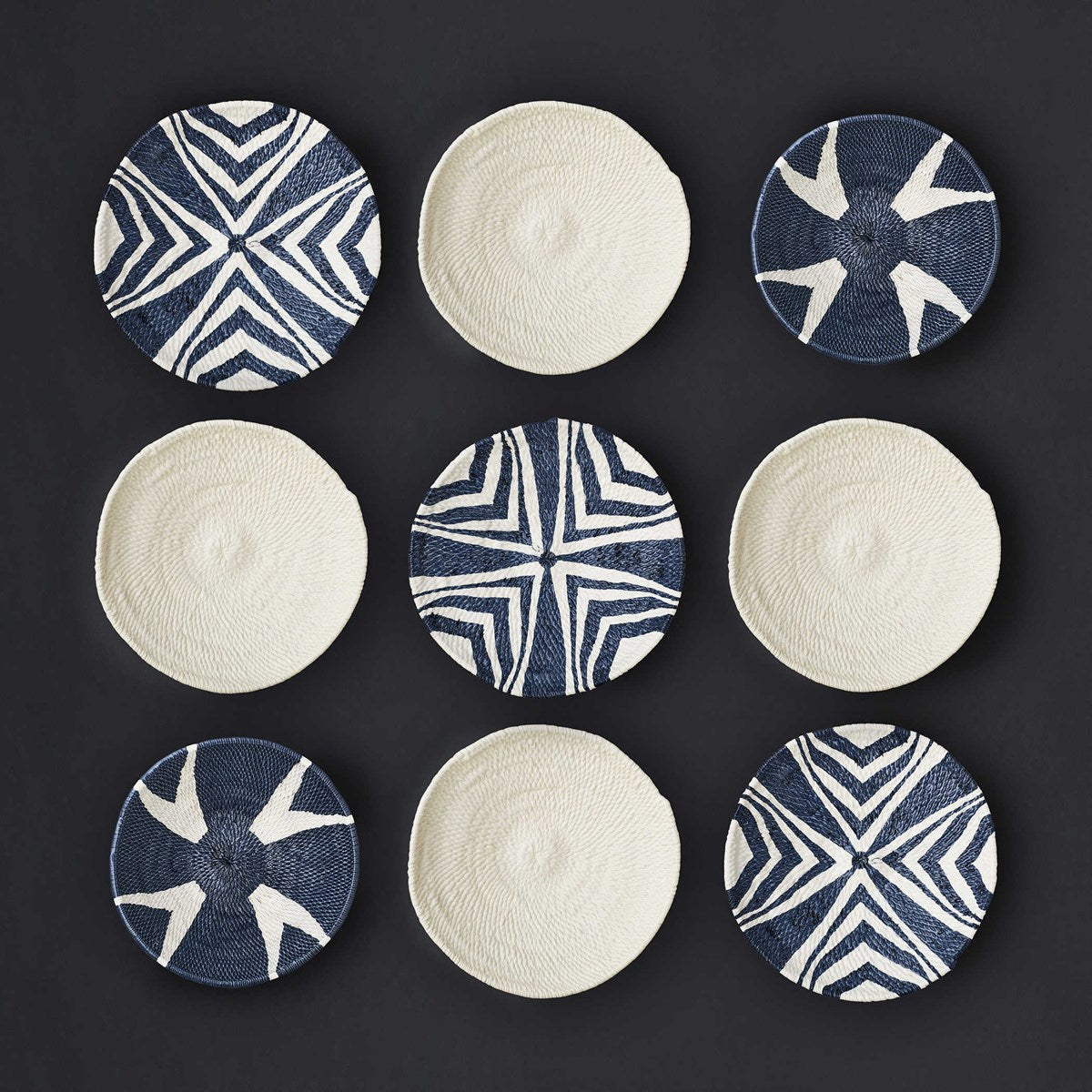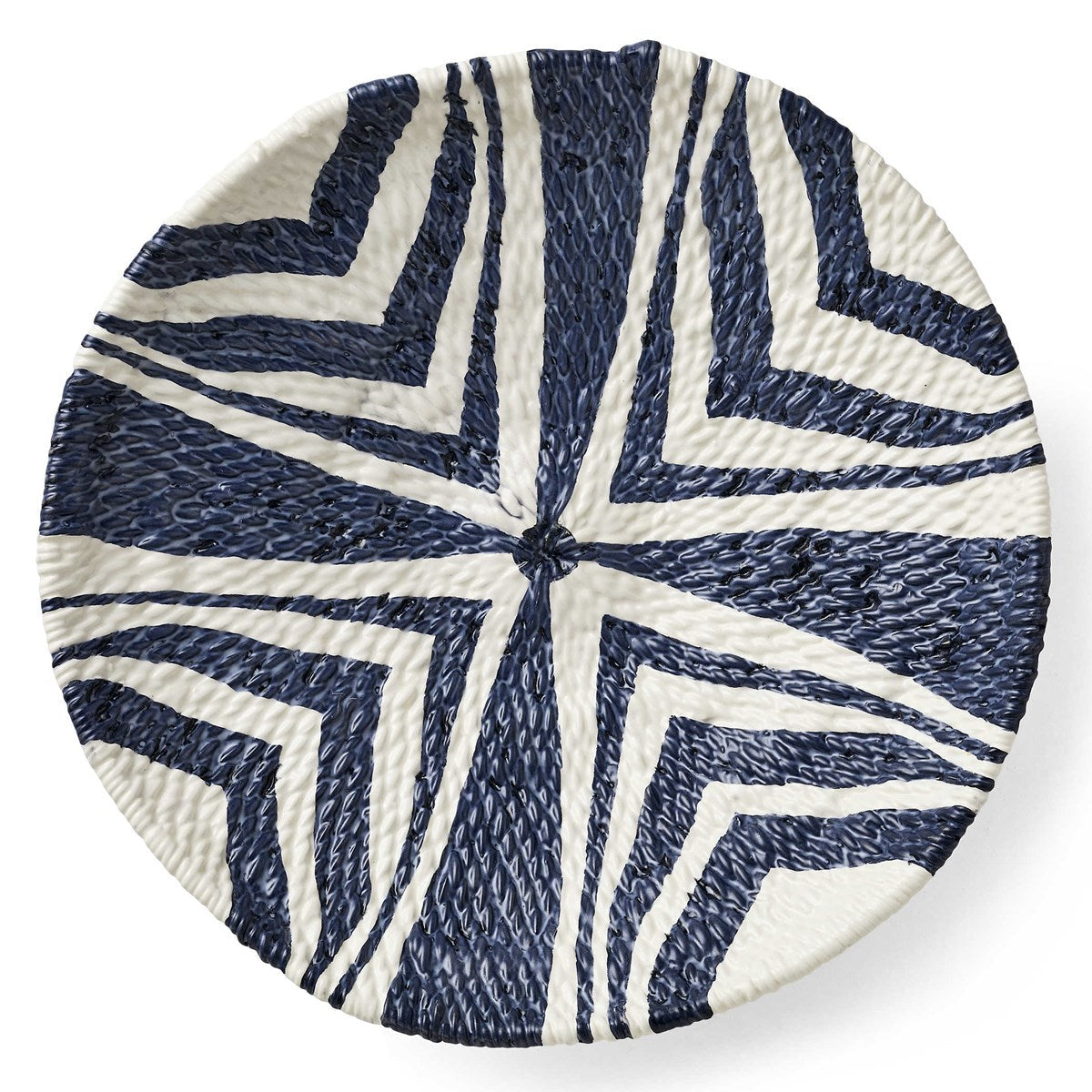 Details & OverviewRich in texture and detail, this ceramic bowl was molded from an authentic wicker basket. Inspired by tribal patterns, off-white and deep indigo glazes enhance the texture and lends to the impression of lost family relics rediscovered. May be hung on the wall or used as a tabletop accessory.
