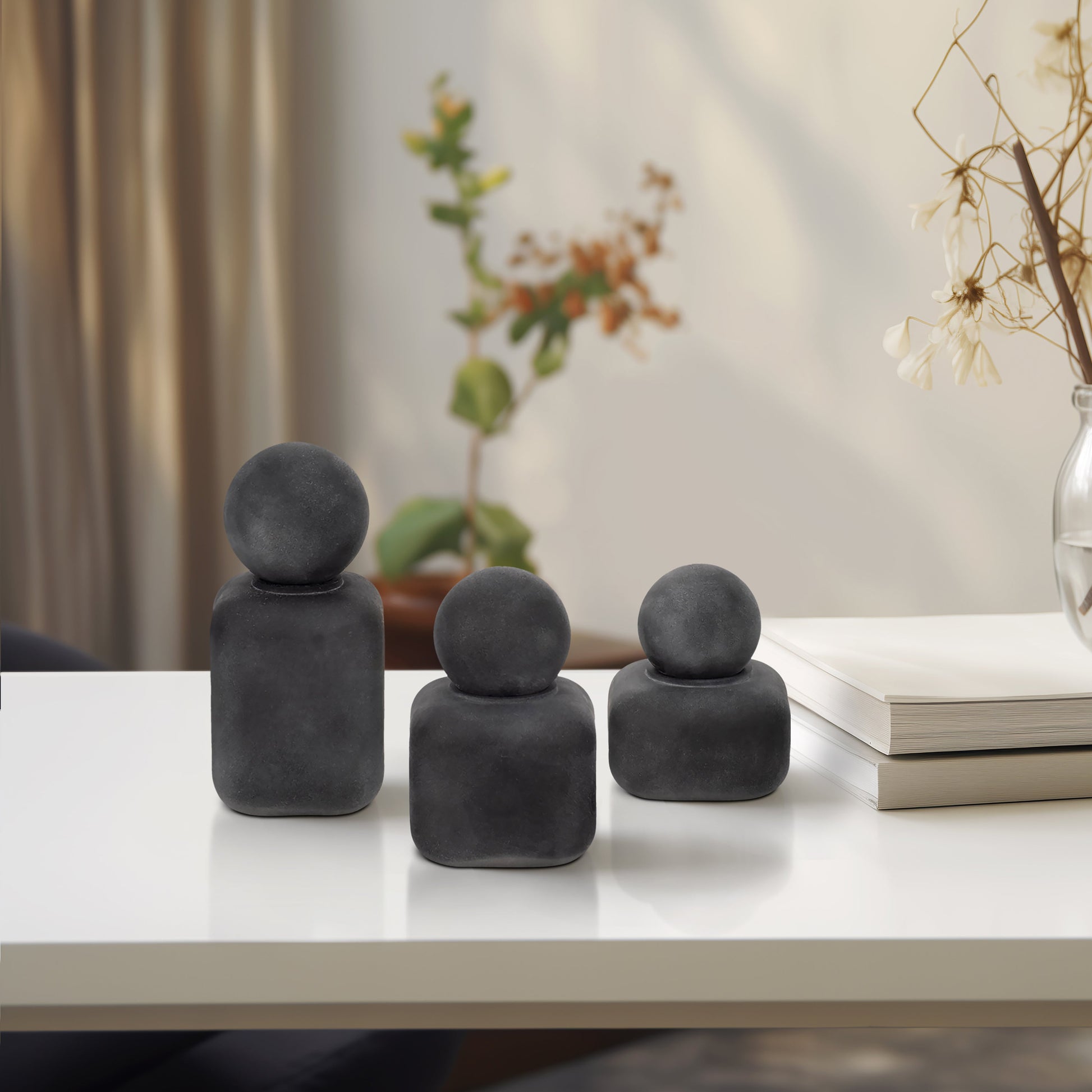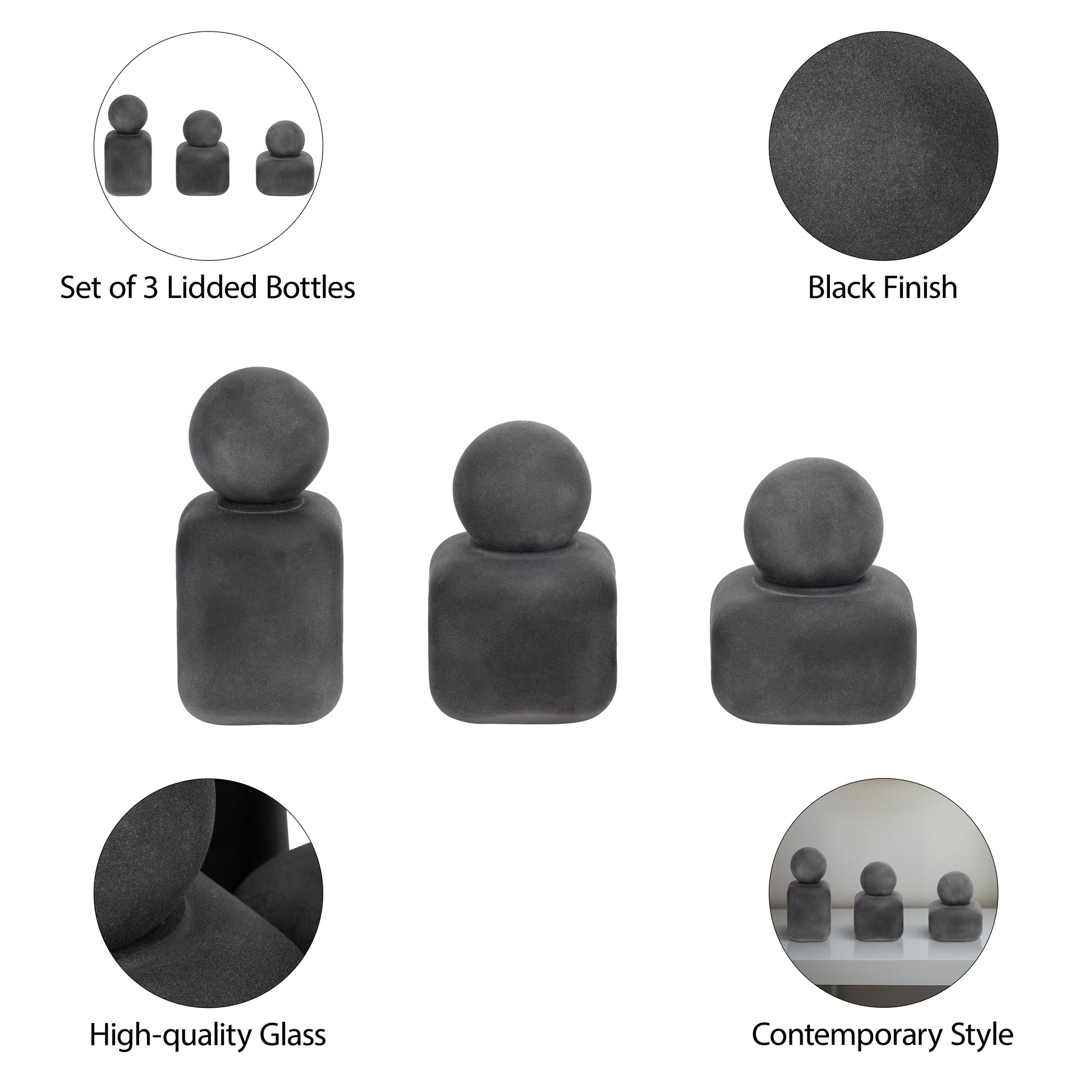 S/3 4/5/6" Mason Black Glass Lidded Bottles
